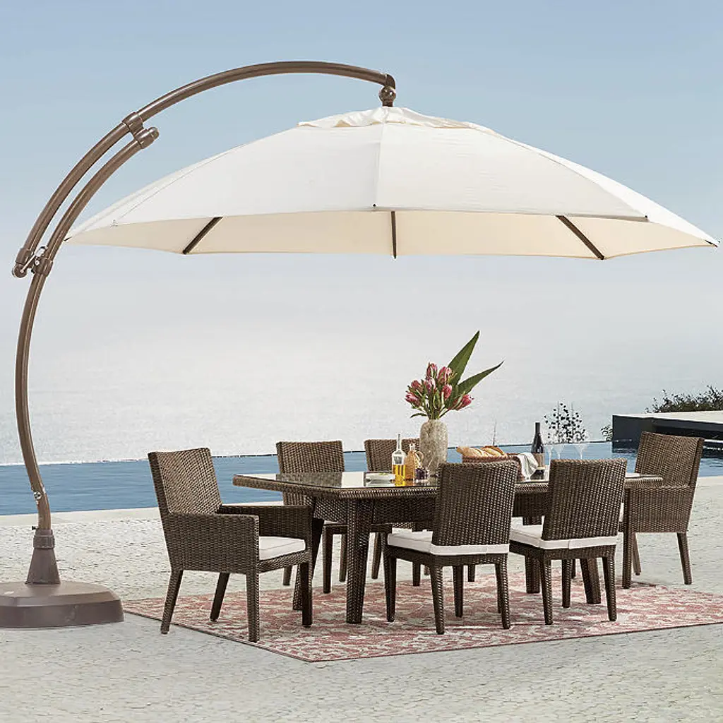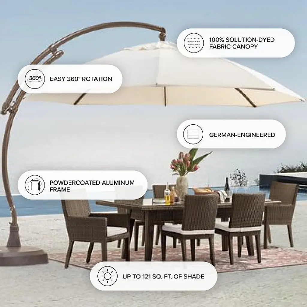 The engineering that makes this umbrella swivel and tilt is so extraordinary, it's been patented by the Germans who invented it. Simply turn the knob to rotate the canopy, and slide a lever to angle it against the sun. The awning-grade canopy pivots easily between furniture settings so you can shade a lounging area and a dining area with one umbrella. German-engineered and 100% made in Europe11-1/2 ft. umbrella offers 95 square feet of shade; 13 ft. umbrella covers 121 square feet Easily rotates 360° with the turn of a knob View umbrella features Built-in shock absorbers at the end of each strut and a vented top help the umbrella withstand windy conditions Canopy made of 100% solution-dyed polypropylene awning-grade fabric resists the damaging effects of sun, mildew and dirt Canopy weighs 8.5 ounces per square yard vs. typical canopies weighing 6.5 ounces or less, and offers superior construction using French seams and locking double-stitching to ensure durability and strength Tieback canopy unzips for off-season storage and spot cleaning Heavy-gauge powdercoated aluminum frame Base measures approx. 2'10" in dia. x 7"H Umbrella becomes a tipping hazard at 20 MPH and will tip over starting around 25MPHBases should be filled with sand-water mixture or p-gravel (not included). For cold climates where temperatures drop below 32 degrees, DO NOT add water. Use a minimum 5 bags of sand, up to 275 lbs. Always close umbrella when not in use, or in inclement weatherSome assembly required Canopy has a 2-year warranty from the manufacturer, 2-year on the frame.Imported. At Frontgate, our primary focus is quality. We guarantee that every product we sell will stand up to the supreme test – our customers' satisfaction. To learn more about our policies, visit our Shipping & Processing, Returns & Exchanges and Warranty & Price Guarantee pages.