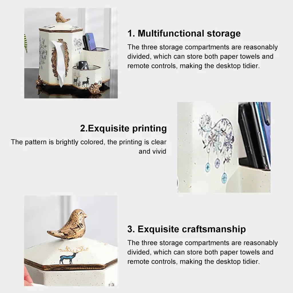 This creative European retro storage tray is made of high-quality resin, combined with American flower and bird patterns, and has two remote control storage spaces and a tissue storage box. The product can be placed in the office or home to improve the level of home decoration and meet the storage needs of bedrooms and living rooms.