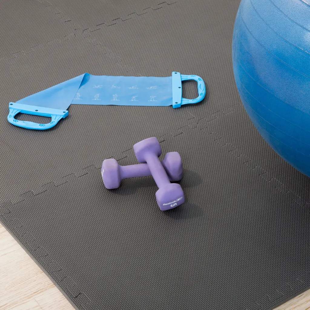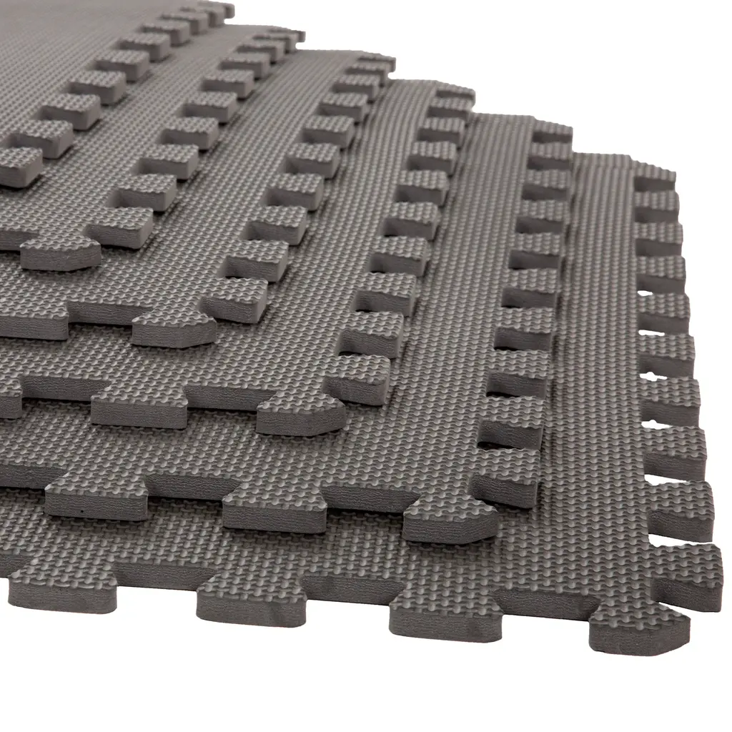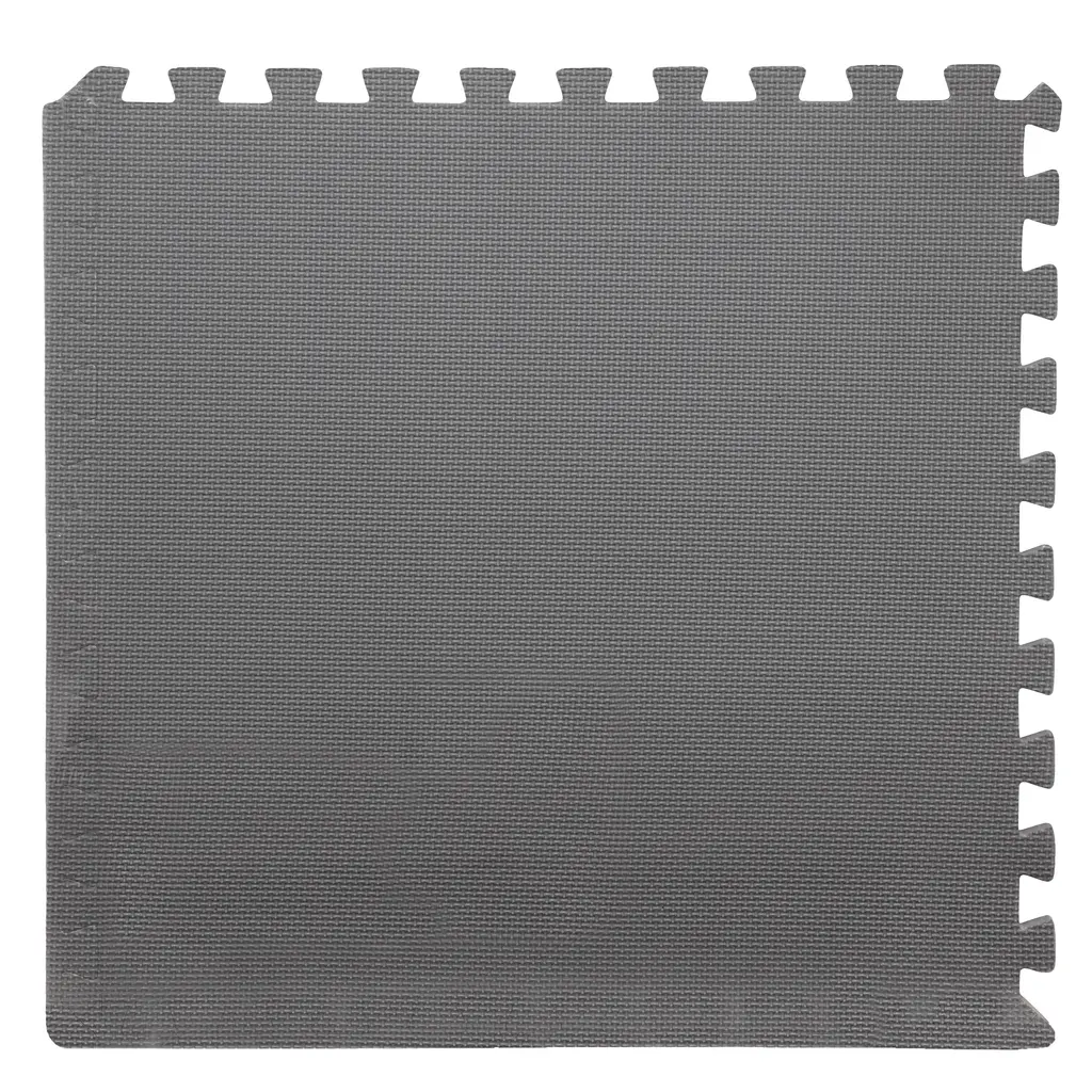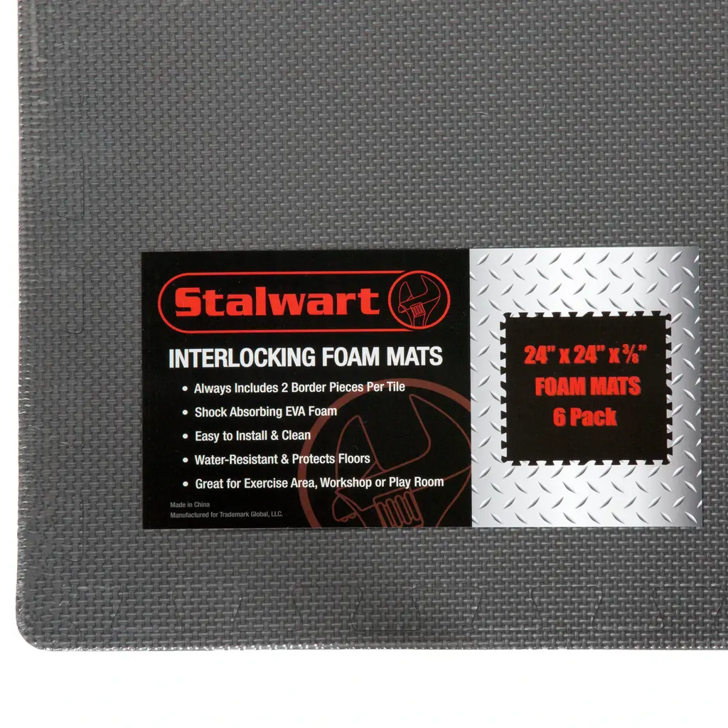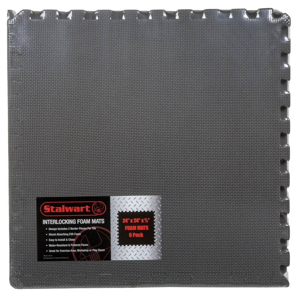 Add cushioned flooring to your exercise area, living room, basement den, or playroom with the Interlocking Foam Tiles by Stalwart. The six tiles of this foam flooring feature an interlocking, puzzle-piece design that you can combine in multiple configurations. The nonskid, textured foam makes this lightweight foam puzzle floor mat an excellent way to safely cushion a concrete floor or protect the finish of a hardwood floor. Nontoxic, free of lead, and easy to keep clean with just soap and water, these foam squares work well as a child's play mat or as a workout mat in a home gym. FOAM TILES FOR FLOOR - The pack of foam floor tiles are used to protect your floor and create a comfortable space with exceptional support and cushion. This EVA foam mat is non-toxic, tested free of lead, BPAs, and Phthalates.MULTIPURPOSE - The floor mats for kids are perfect for workshops, kids' playrooms, and spaces where you do yoga, Pilates, or weightlifting. The foam tiles' non-skid textured padding can be used anywhere in the house that needs extra cushioning.INDOOR AND OUTDOOR USE - Not only can these workout pads for floor be used in any room you might be standing for long periods, but they can also be used while camping, to create soft flooring in your tent.EASY ASSEMBLY - The foam mats for kids connect easily and can be disassembled just as simply for quick storage. These exercise floor mats require no special upkeep and are easy to clean with just a damp cloth and mild soap.PRODUCT DETAILS - Materials: EVA Foam. Tile Dimensions: (L) 24" x (W) 24" x (H) 0.375"; Coverage Area: 24-Square-Feet. Color: Gray.