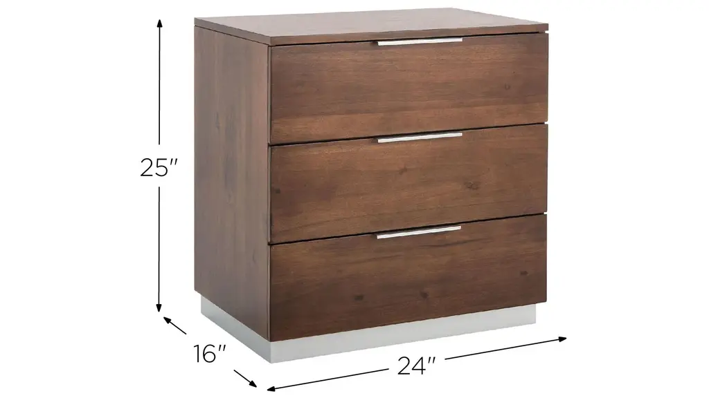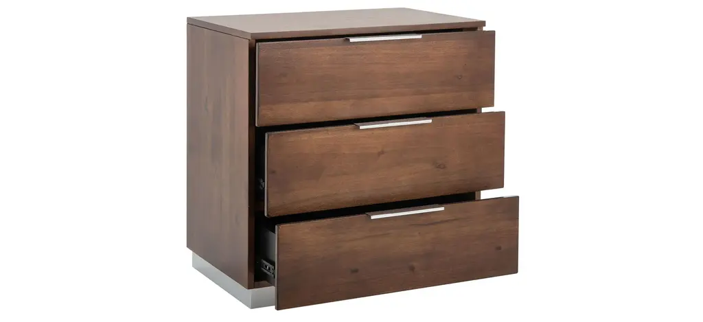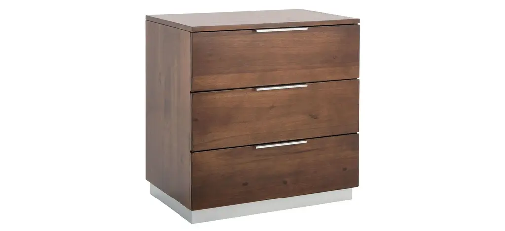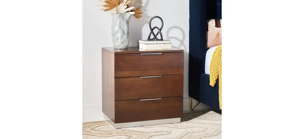 A stylish study in artistic contrasts, this Eva 3 Drawer Nightstand is designed to showcase the best of rustic warmth and contemporary chic. Eva's dark walnut finish beautifully juxtapose with its chrome-plated metal pulls and plinth, making for a versatile look that's always in vogue.