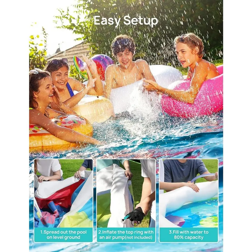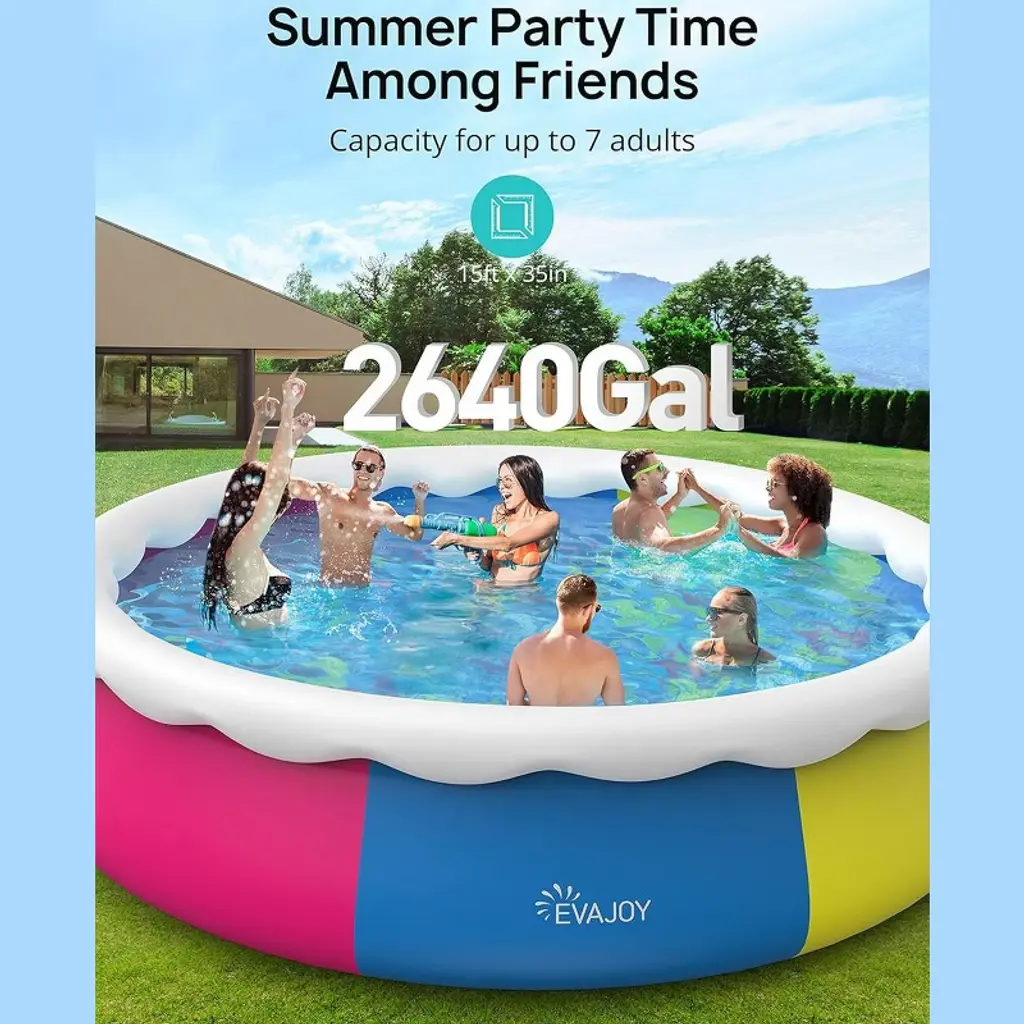 The EVAJOY swimming pool measures 15 ft in diameter with a 35 inches depth. The pool has a maximum capacity of 2640 gallons and can accommodate up to 7 people, making it perfect for splashing around with your family and friends all summer long. Simply place the pool on level ground, inflate the top ring with the air pump (not included), fill the pool 80% with water, and you're ready to enjoy summer fun. (Note: Avoid rubbing and touching sharp objects during the process). Made of robust 0.6mm 3-ply reinforced PVC material to provide strong support for your swimming pool. The surface of the inflatable pool is protected with a UV-resistant coating that prevents it from fading in direct sunlight. The above ground pool comes with filter pump, ground cloth and pool cover. The filter pump can pump up to 800 gal of water per hour, a pool cover can keep out dirt and debris, and a ground cloth to provide protection against abrasions. In the hot summer, a cool pool party is essential, EVAJOY inflatable swimming pool will be your best choice, whether in the garden, backyard or amusement park, it will bring you and your friends unlimited fun.