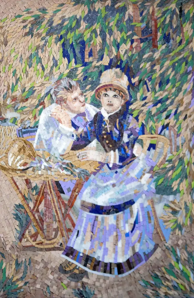 Stone Mosaic Reproduction of Rain by Evelyn Ackerman where we see stones of different colors stuck together like a puzzle forming a beautiful colorful design.The design consists of two people standing in the rain and holding an umbrella.This stone mosaic is a true manifestation of art.