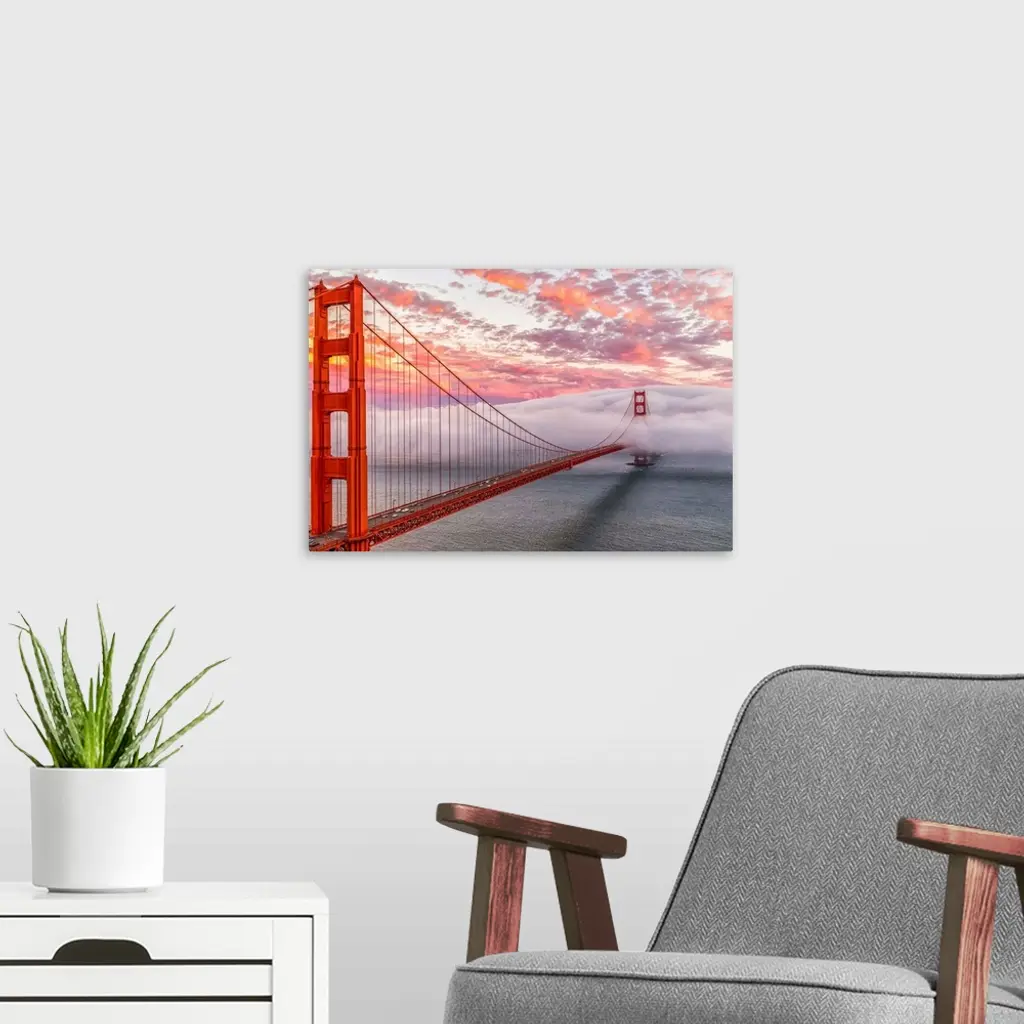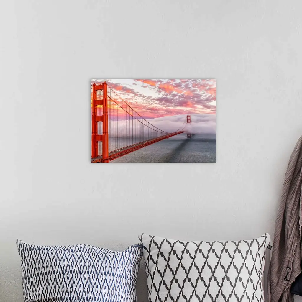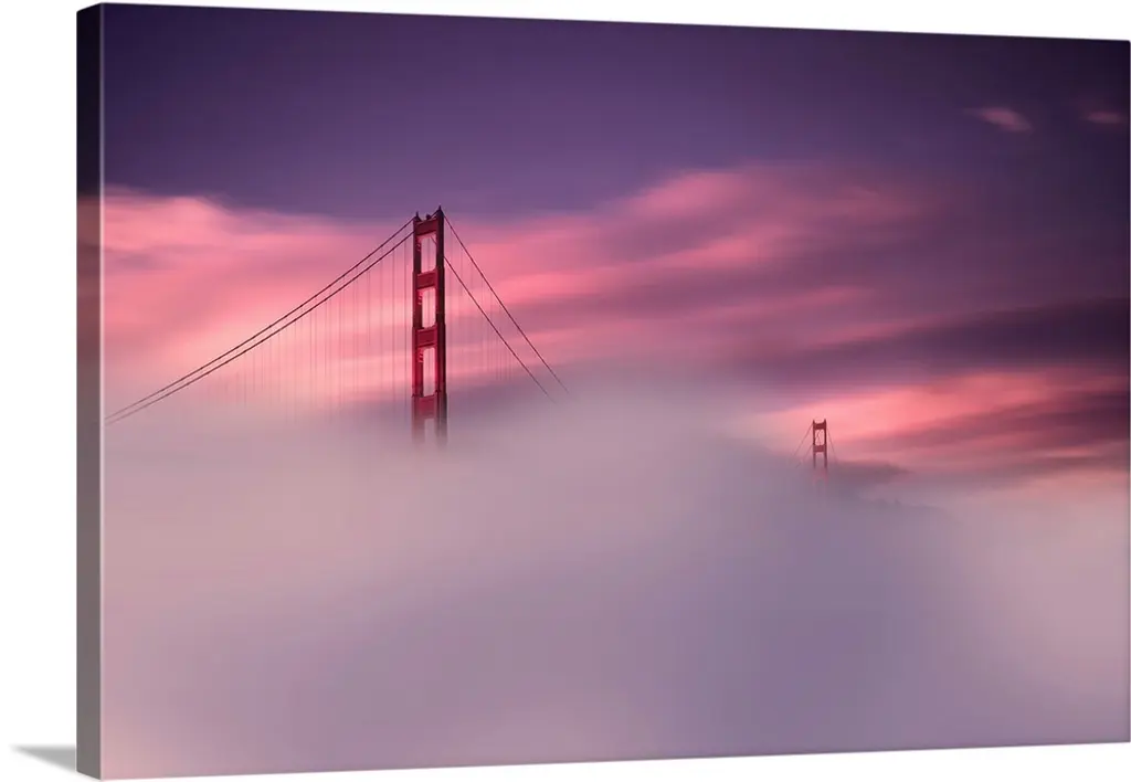 A dynamic photograph of the golden gate bridge disappearing in a thick blanket of clouds.