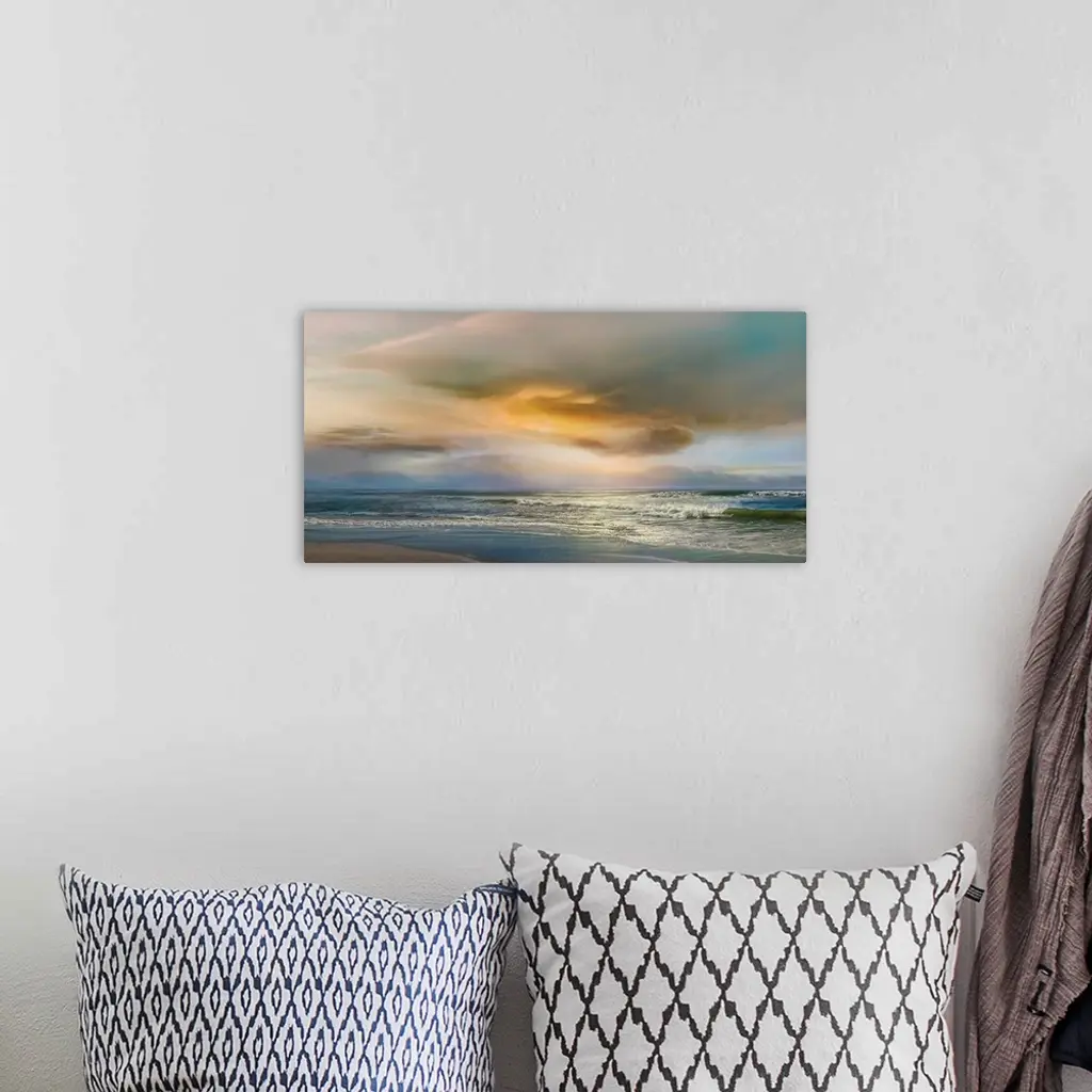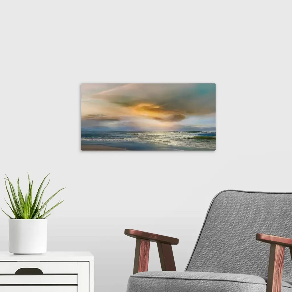 Large photograph of gentle waves on a beach with a colorful sunset.