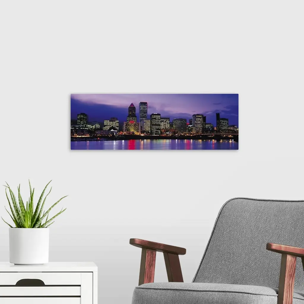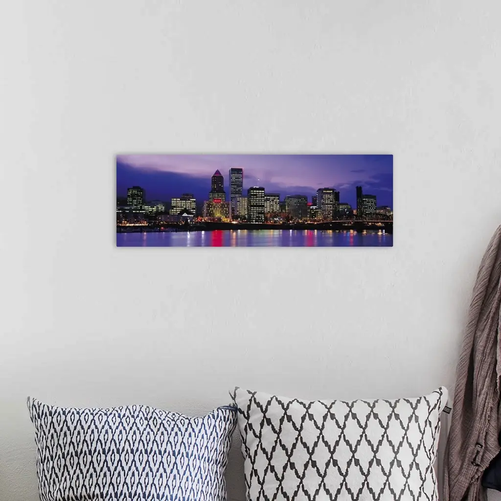 Panoramic photograph on a big canvas of brightly lit buildings of the Portland skyline, reflecting in the water in the foreground, in Oregon.