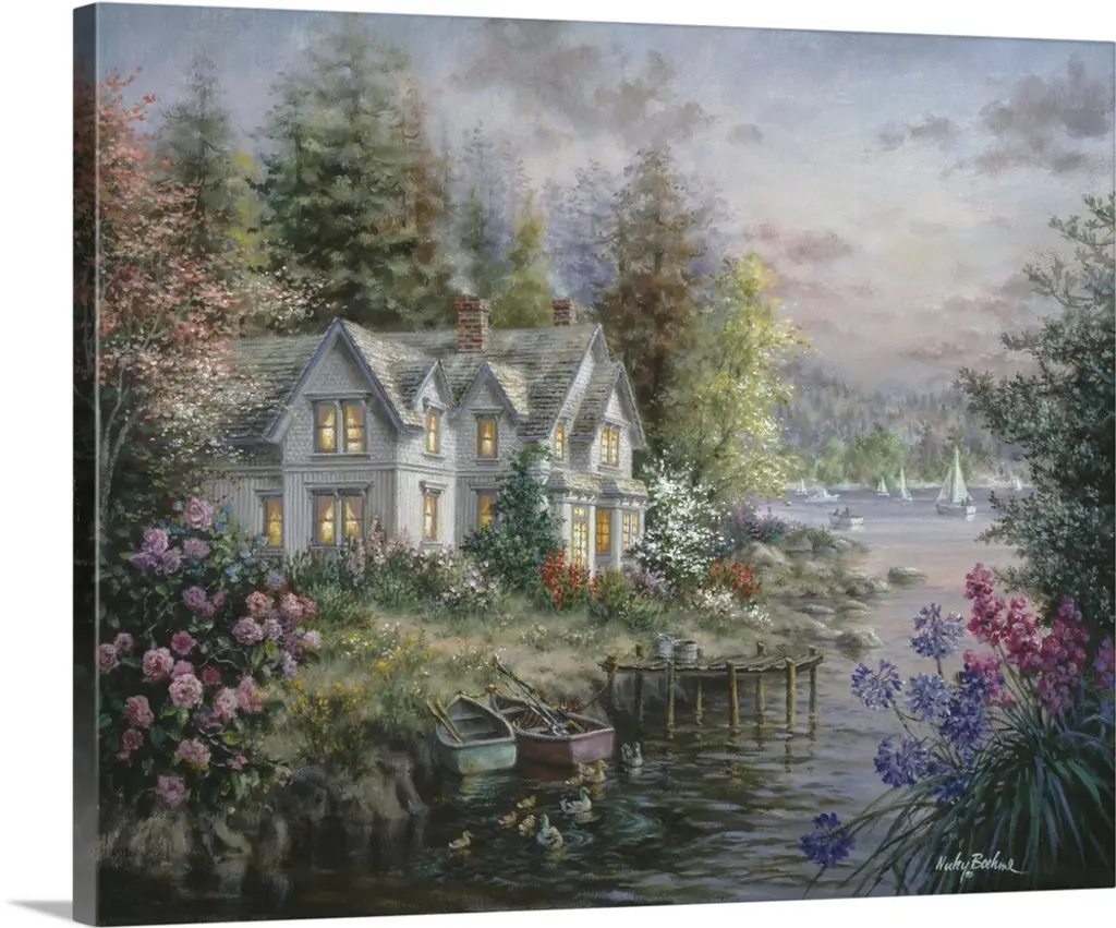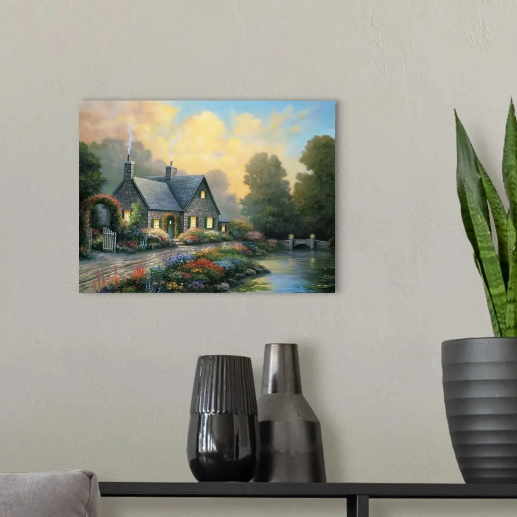 stone cottage, smoke rising from chimney, colorful flowers at the edge of a small river/creek