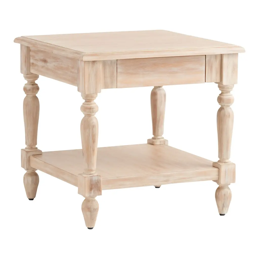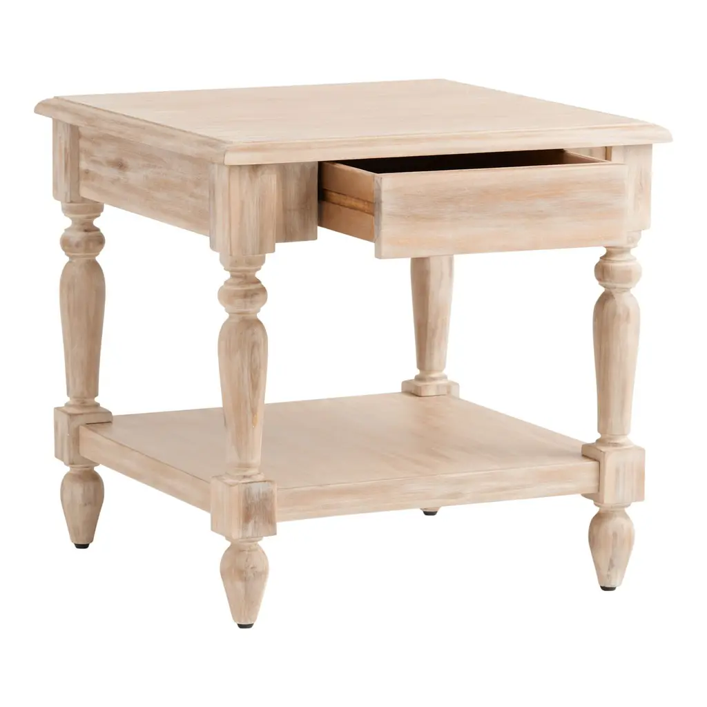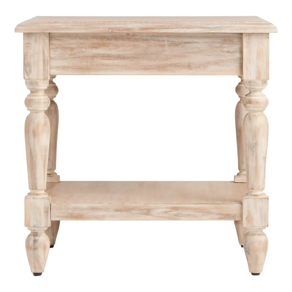 Crafted of natural wood with a weathered finish, our exclusive Everett end table impresses with its Victorian-inspired architectural good looks. A hidden drawer and an open shelf provide ample storage alongside the sofa, bed or settee. With vintage-style sculptural legs and a subtly weathered rustic finish, this farmhouse table is versatile enough to complement a range of decor and furniture.