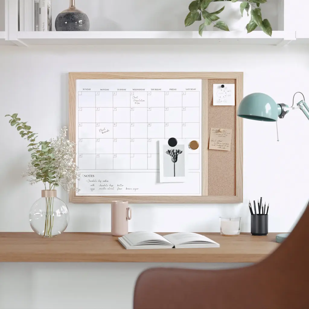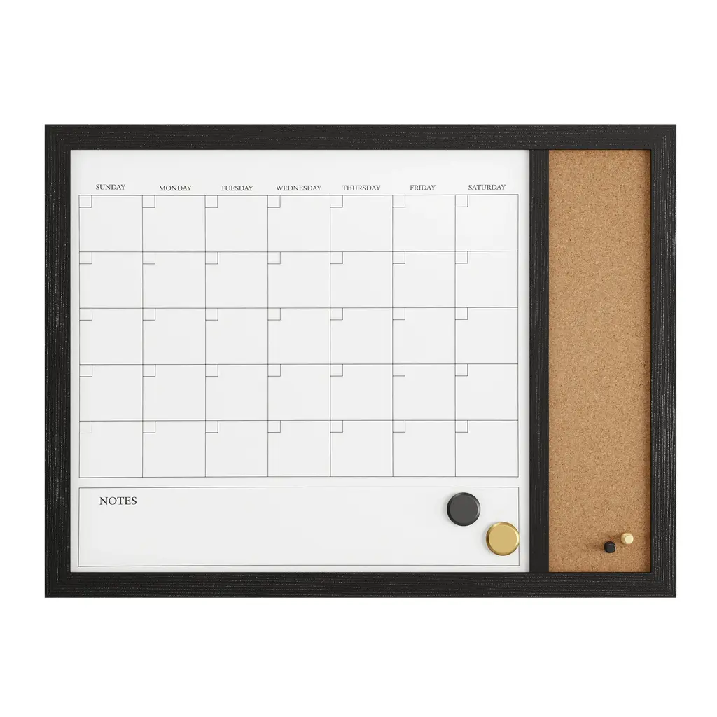 Everette Magnetic Dry Erase Monthly Calendar And Cork Board Combo With Included Marker, Magnets, And Push Pins, Woodgrain Frame
