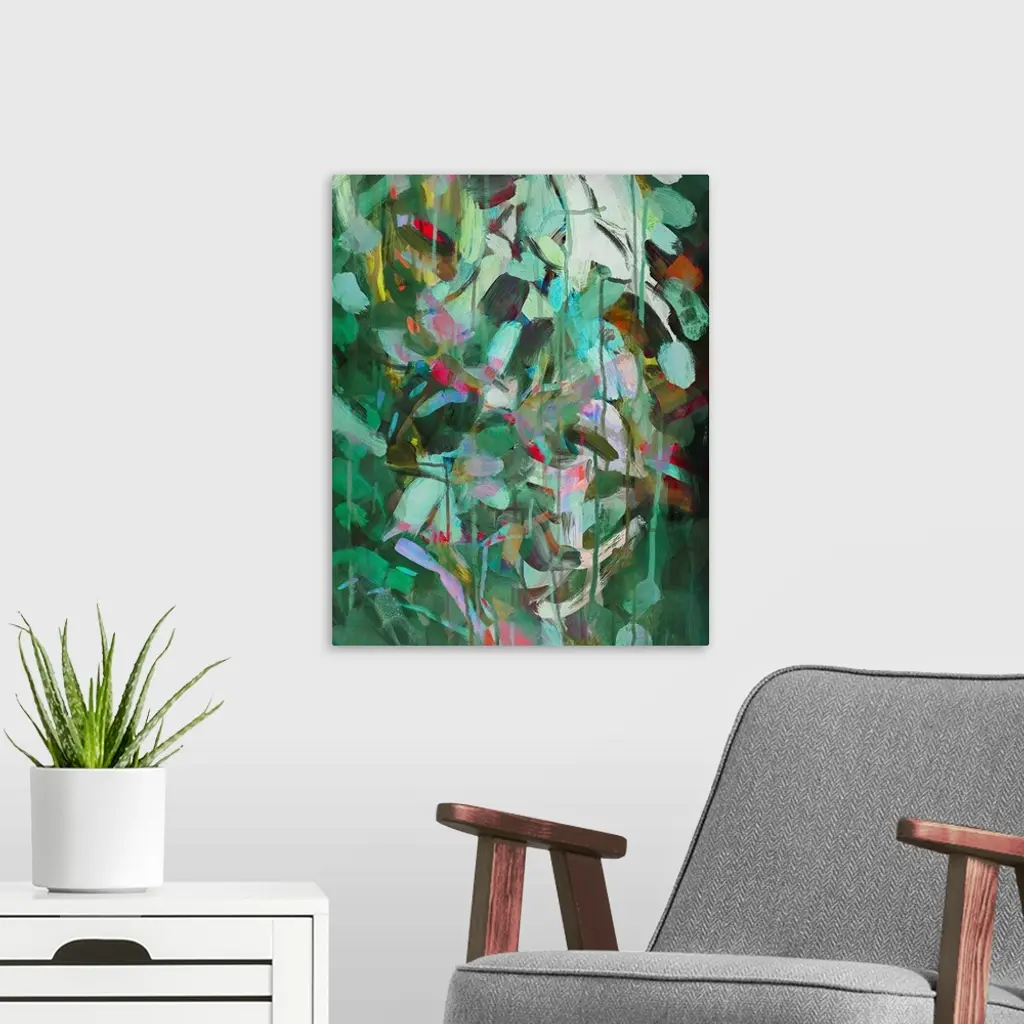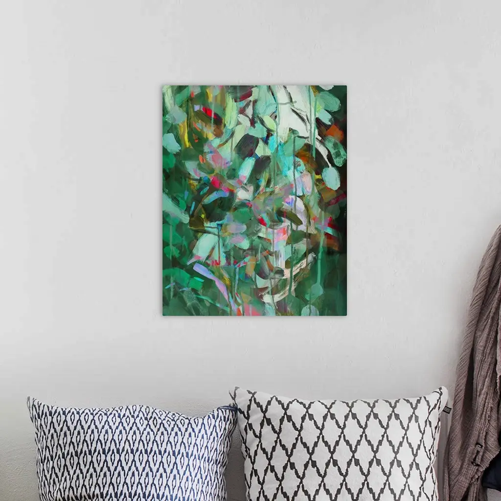 Vertical abstract of multiple colors of paint applied in short brush strokes in varies directions.