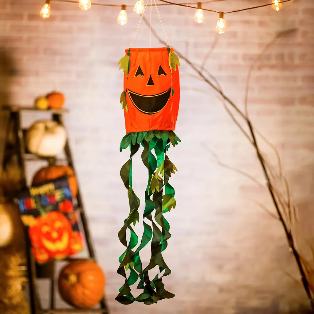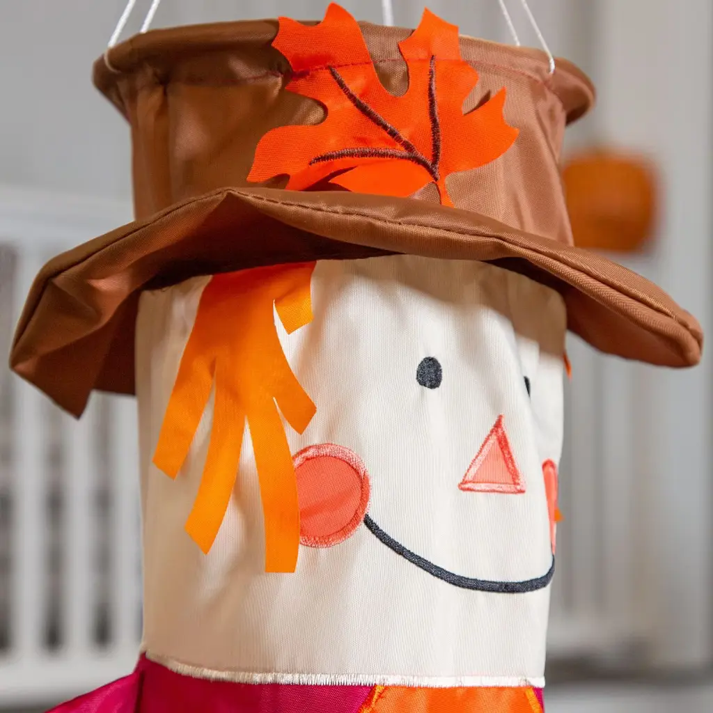 Bring the wind to life in your front yard with this friendly scarecrow, welcoming the change of seasons and the coming of autumn weather! Each windsock is made of durable 310 denier nylon to ensure the design will withstand all types of weather and includes attached cords for easy hanging. The applique process combines pieces of fade resistant fabric with detailed hand-stitching to create a 3D design. The soft, yet heavy-weight character illuminates in the sunlight, while the hanging fabric strips will catch the wind and delight in any breeze.