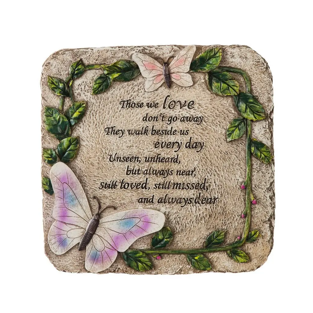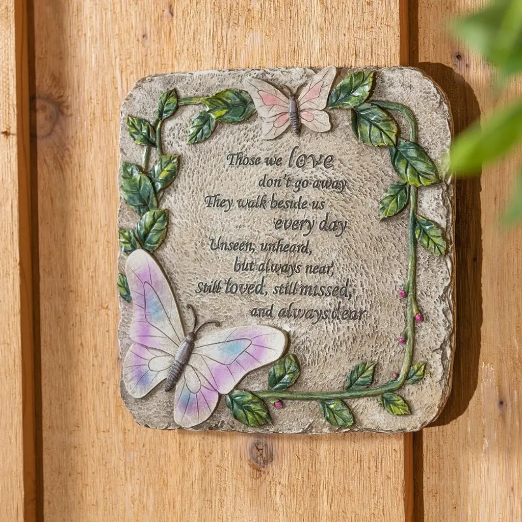 Crafted to look like a real stone, this "Those We Love Don't Go Away" garden stone serves as a memorial for relatives and friends. Made of outdoor-safe painted polystone, the round stone features a butterfly and vine design. At Evergreen, we are committed to producing premium, quality products to bring a touch of color and personality to your home. We respect and celebrate the uniqueness in everyone by offering one of the world's largest selections of home and garden decor.