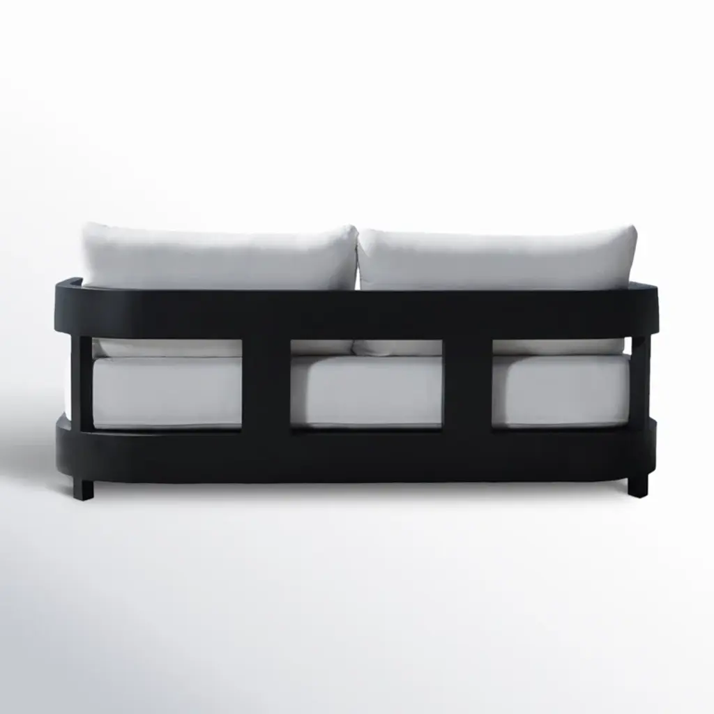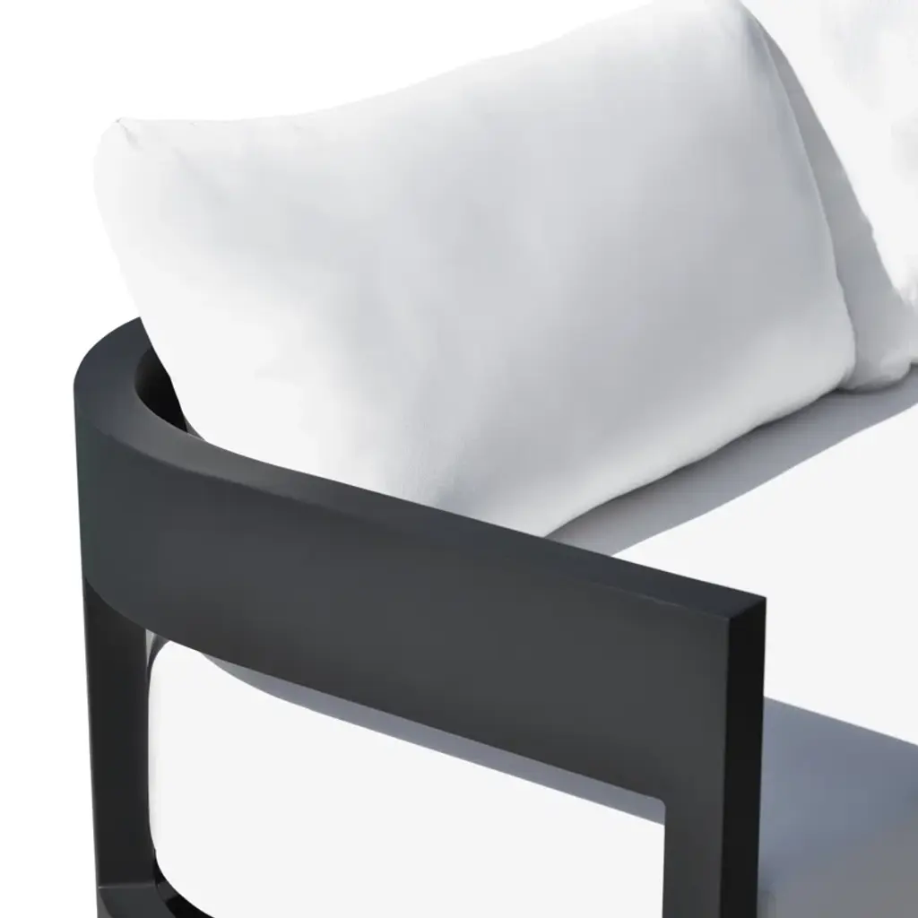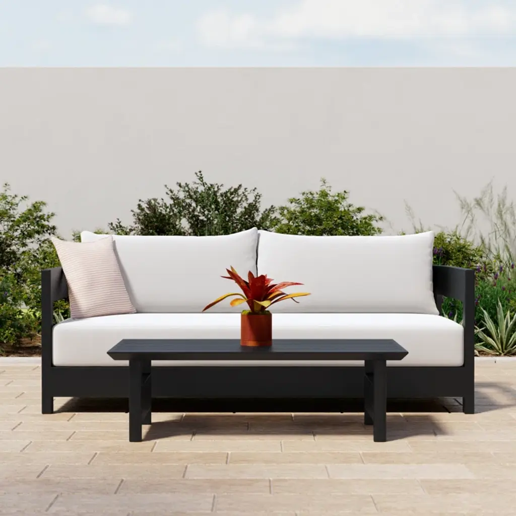 Create a casual, breezy retreat in your backyard or on your patio with this outdoor sofa and coffee table set. Designed with comfort in mind, it's a perfect edit to your main hangout space. Durable powder-coated aluminum comes in a sleek black finish, while Sunbrella® seat cushions and pillow backs are padded for just-right support. The muted color palette makes it easy to mix and match with your signature style.