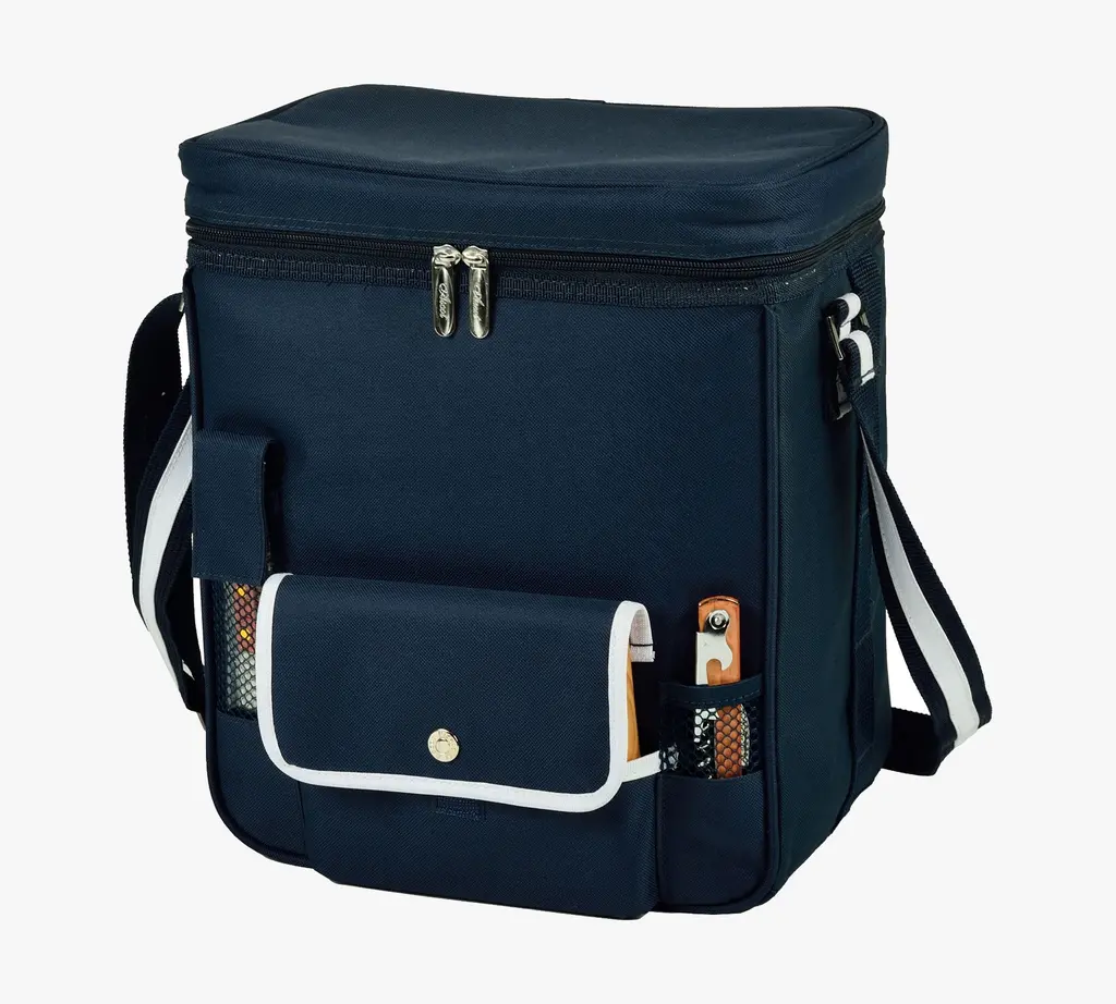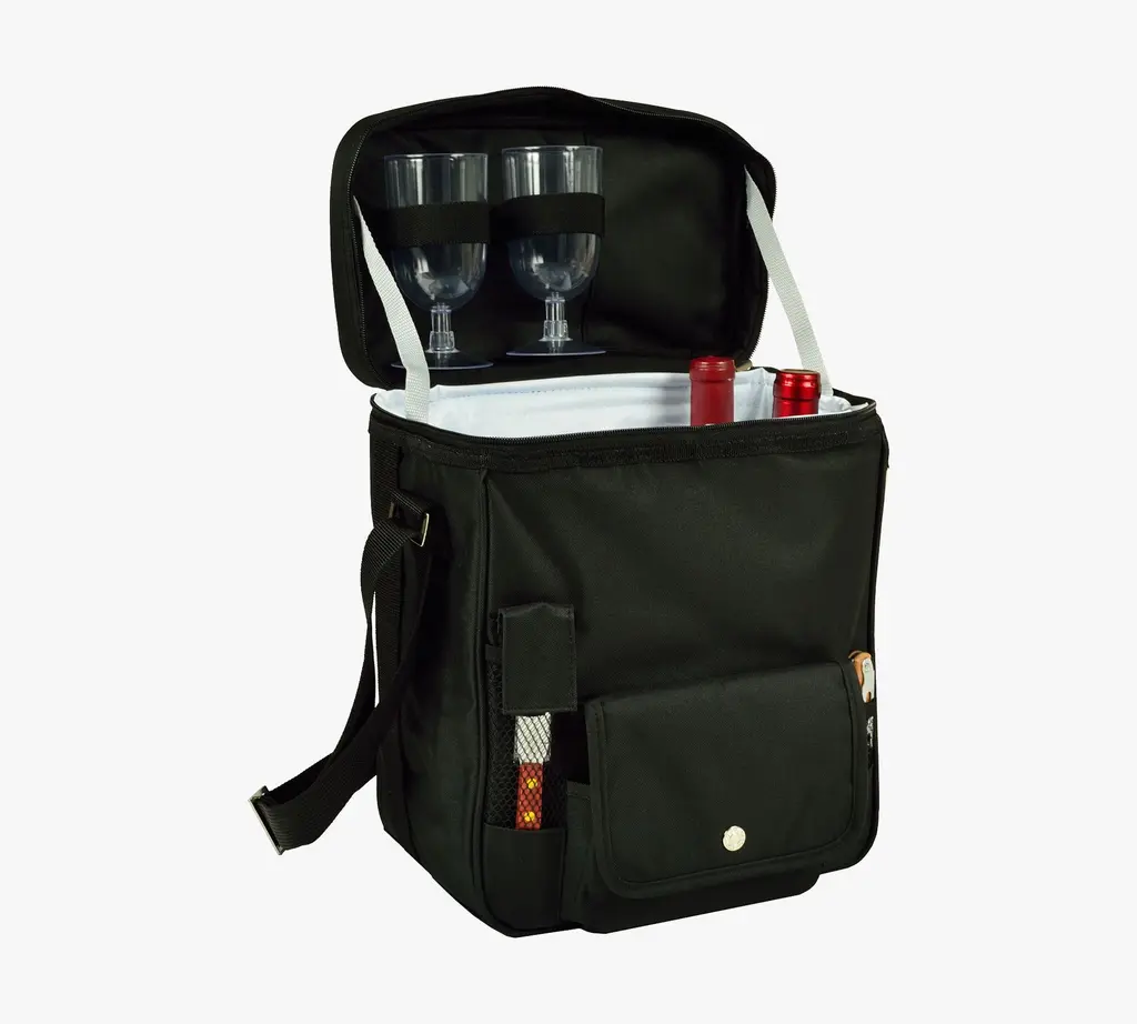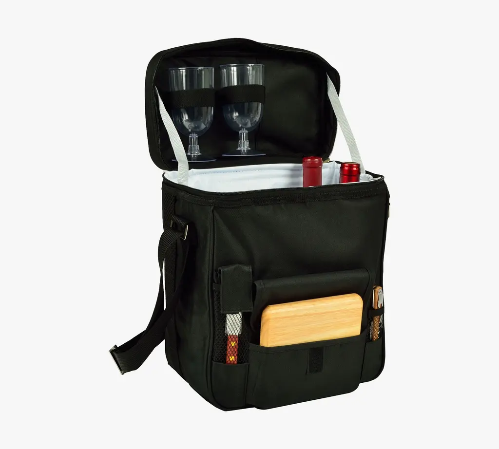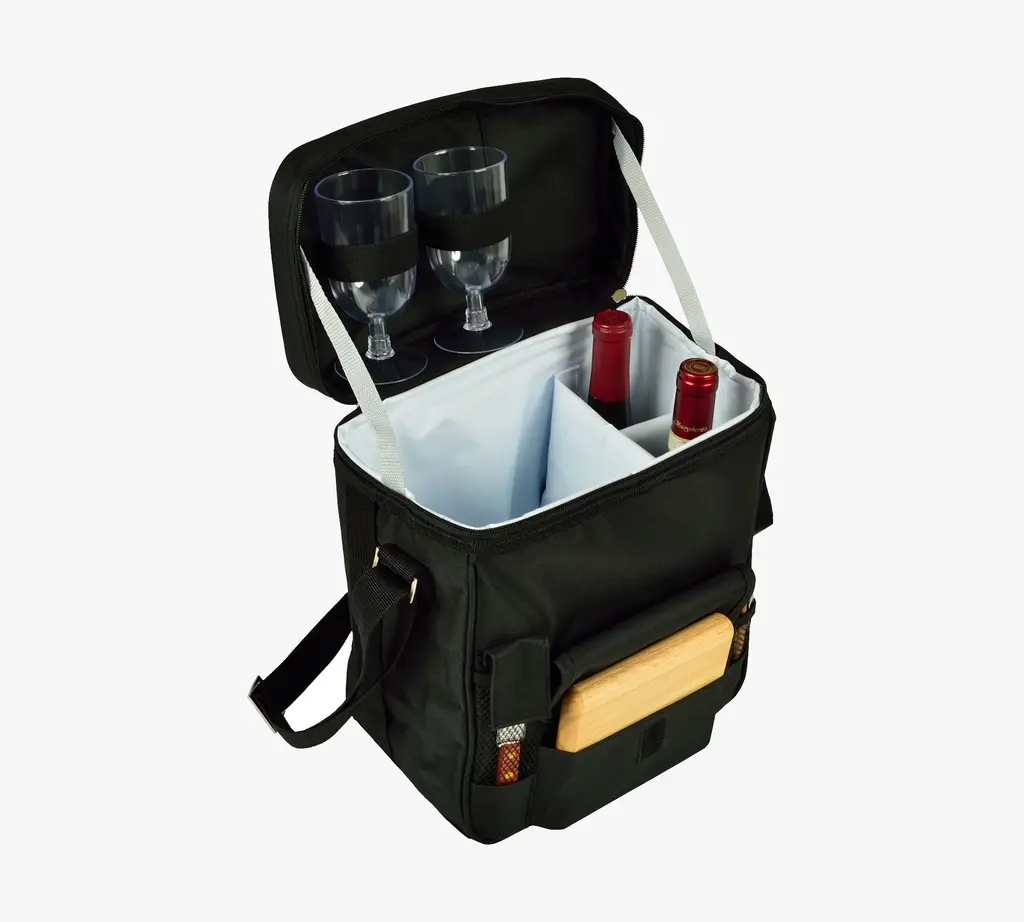 Perfect for a simple picnic during your next outdoor jaunt, this insulated cooler keeps wine and charcuterie chilled and ready for serving. It includes a wooden serving board, cheese knife and corkscrew, plus two acrylic wine glasses. The wine compartment has a padded separator to protect two bottles from bumps during travel, and a handy shoulder strap is adjustable for comfortable carrying, no matter how long the trek.