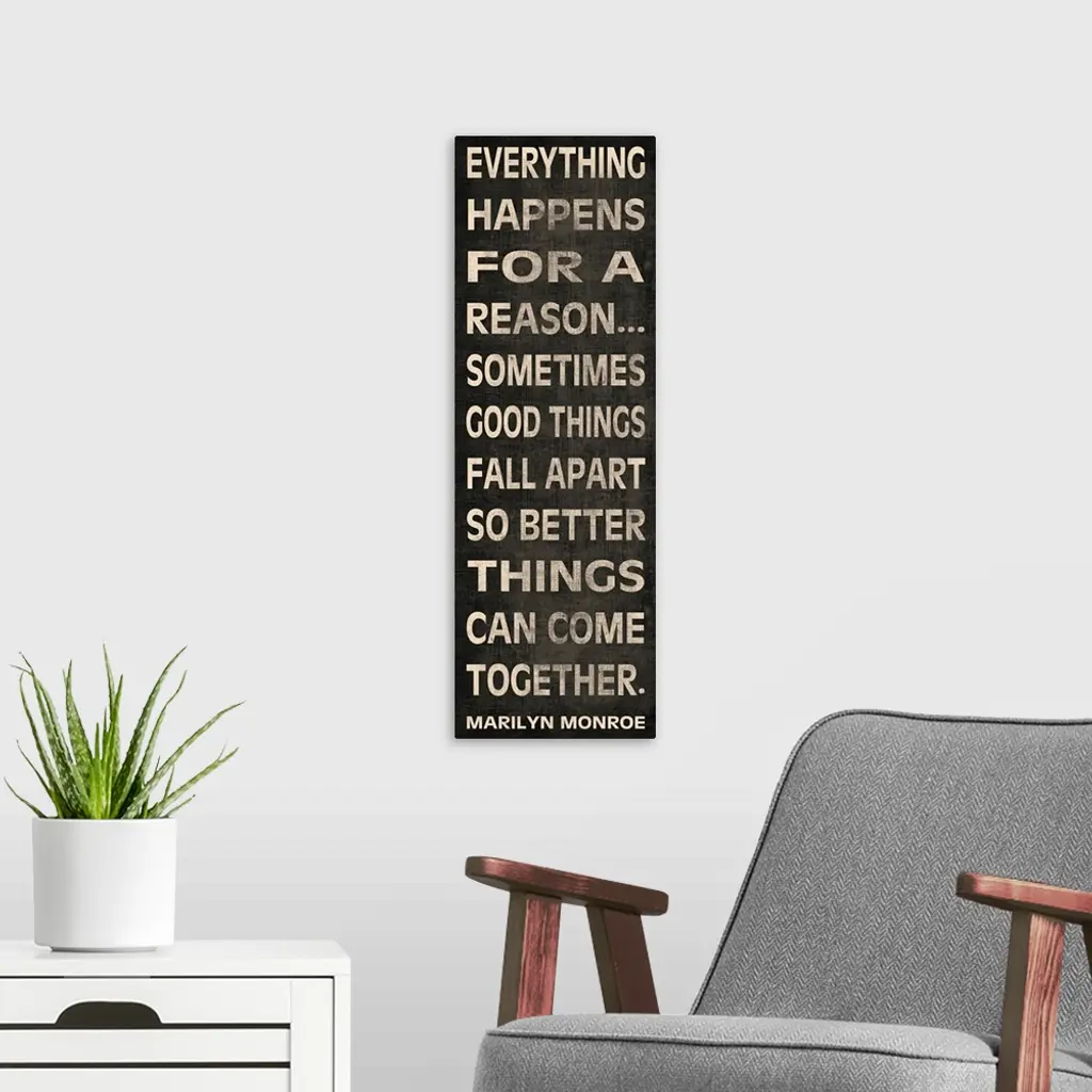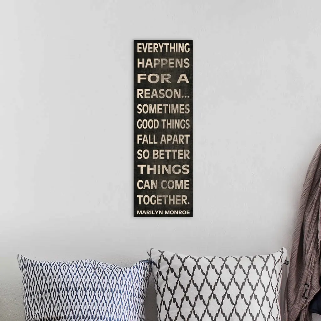 Vertical, inspirational typography art on large canvas that reads: "Everything happens for a reasonosometimes good things fall apart so better things can come together. Marilyn Monroe".