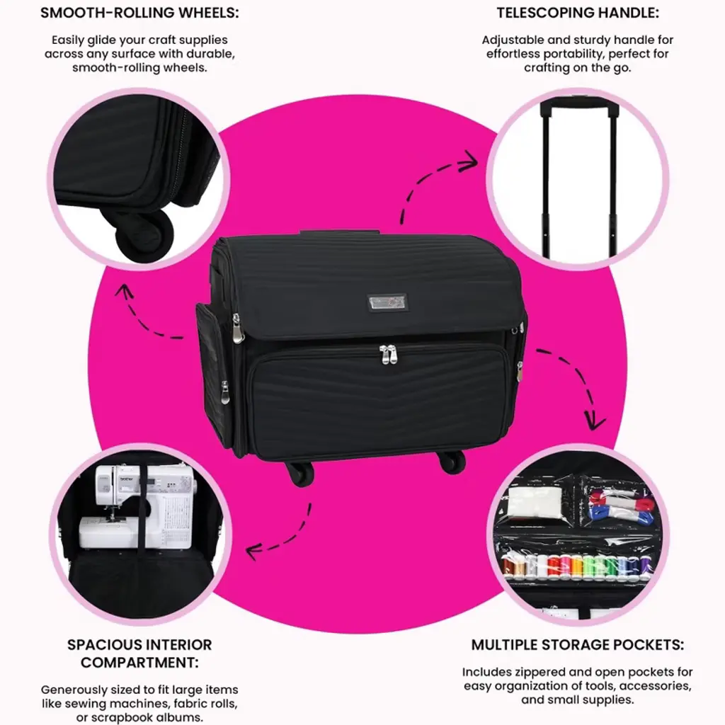 Everything Mary presents the XL Roller, a versatile and durable storage solution designed for the passionate crafter. Whether you’re a sewer, scrapbooker, cross-stitch enthusiast, or jewelry maker, the XL Roller is your ideal companion on your creative journey. Crafted from premium polyester, this spacious tote accommodates everything you need, from sewing machines and quilting supplies to paper crafting tools, beads, and embroidery accessories. With multiple pockets for easy organization and a secure interior strap to keep your sewing machine in place, the XL Roller ensures that your supplies are always safe and ready to go wherever your creativity takes you. Whether you’re traveling to workshops, crafting events, or simply moving between projects, the XL Roller keeps your tools organized and easily accessible, helping you stay focused on your passion. With Everything Mary, you can embark on your crafting journey with confidence and style, knowing that your supplies are in good hands.Interior Dimensions: 19.5L x 10.5D x 14HExterior Dimensions: 22L x 13.50D x 17.75H