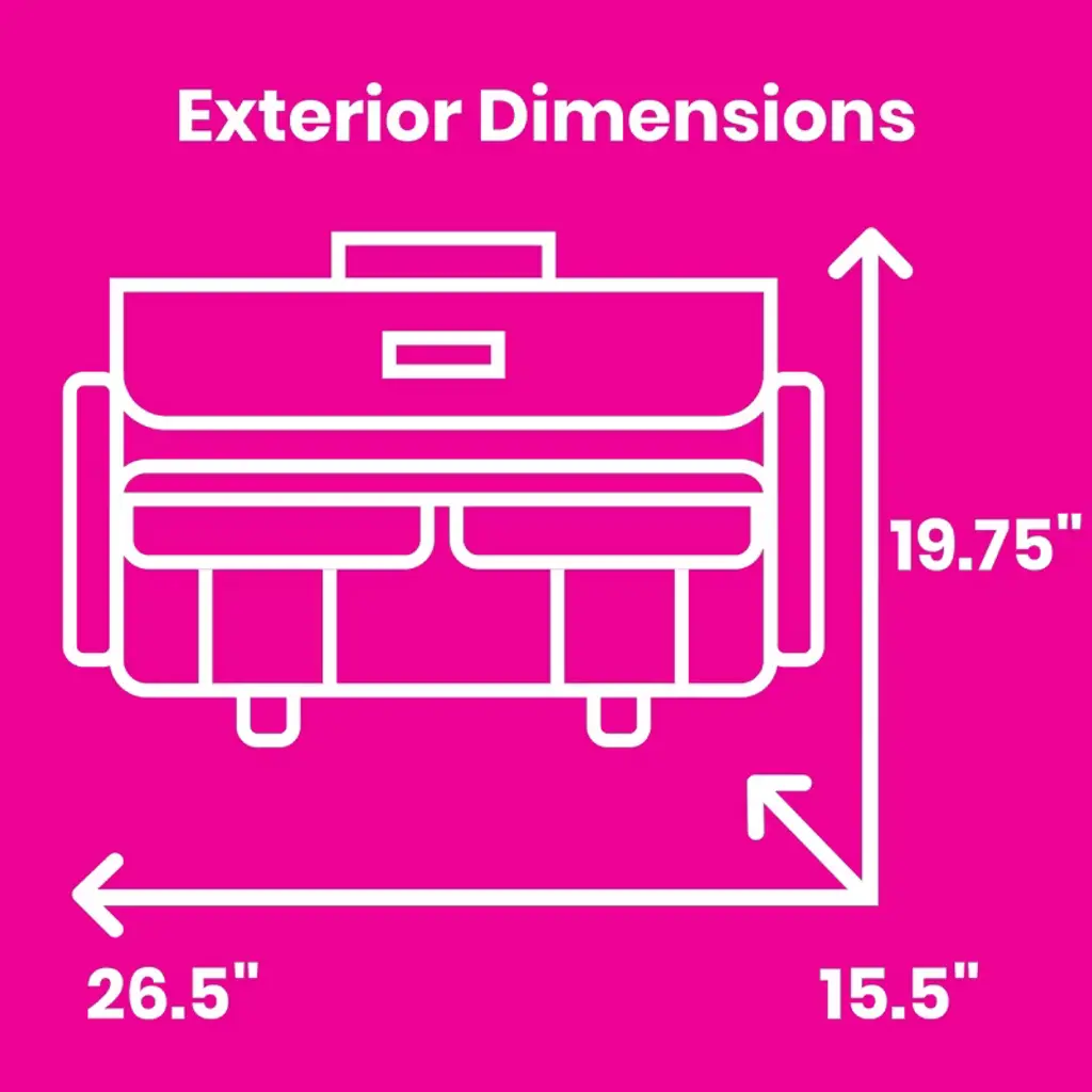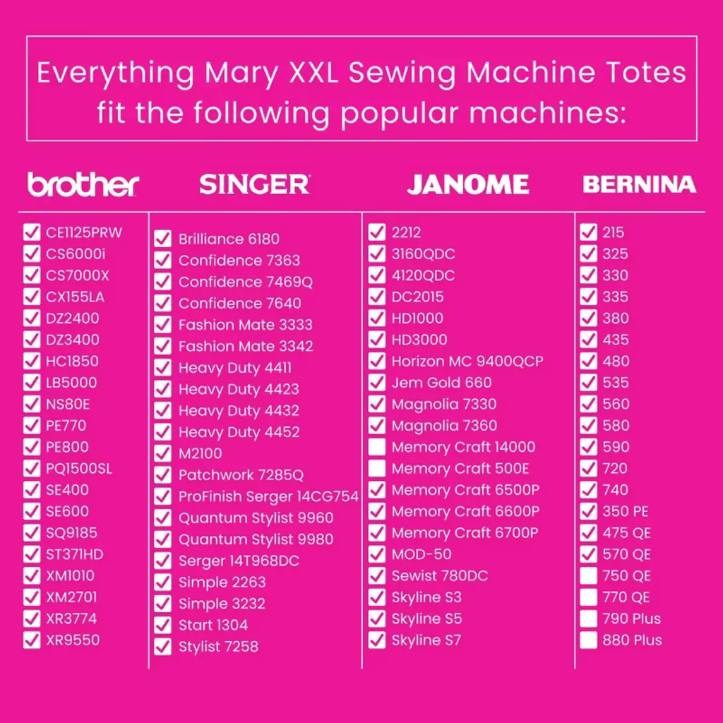 Interior dimensions: 22" L x 12.5" W x 16" H Exterior dimensions: 26.50" L x 15.50" W x 19.75" H The Everything Mary XXL Rolling Sewing Tote was designed with larger sewing & embroidery machines in mind. The XXL sewing bag on wheels is nothing short of premium. Our sewing machine storage case is constructed with a beautiful, high-quality polyester material that is smudge-proof and easy to clean. This carrying machine case keeps your valuable Brother, Singer, Babylock, Viking, or any other large sewing machine case safe and concealed. Along with large sewing machine storage, this case features multiple storage pockets, a locking handle, convenient carry straps, an interior machine strap, and 4-wheel Quad Rollers. The Everything Mary XXL Rolling Sewing Tote was made with crafters in mind.