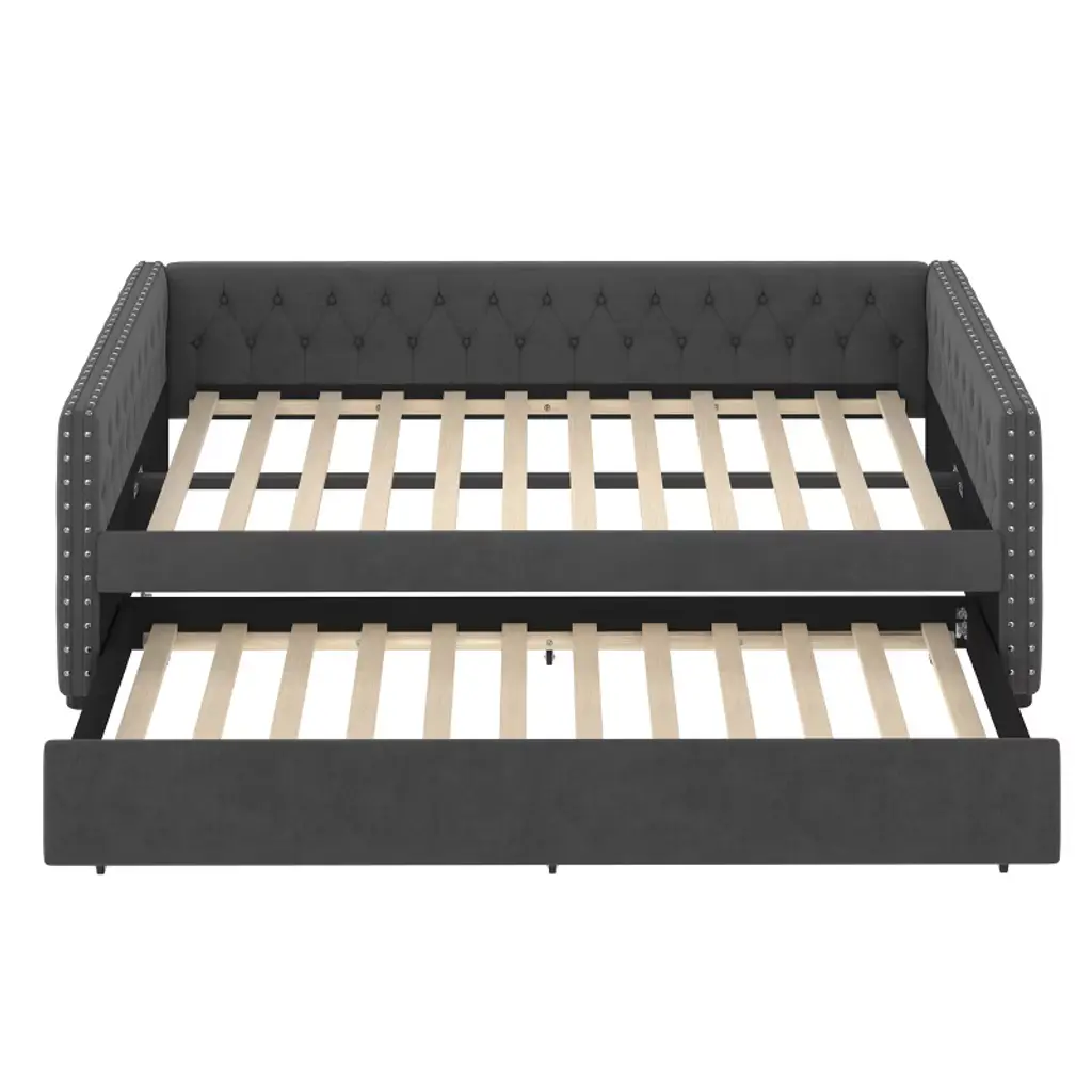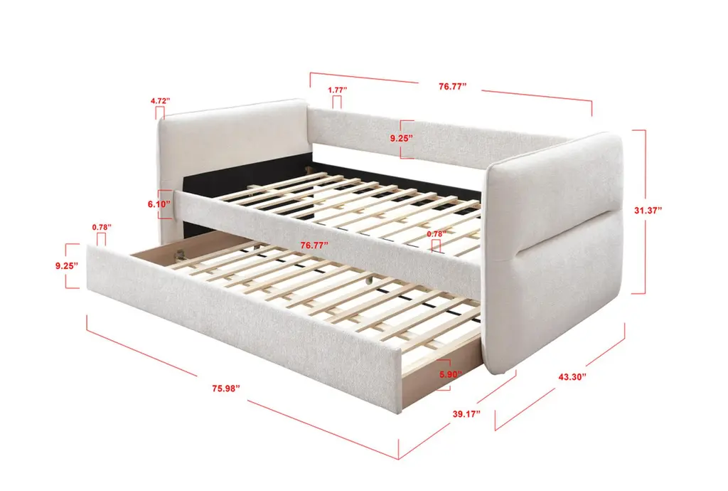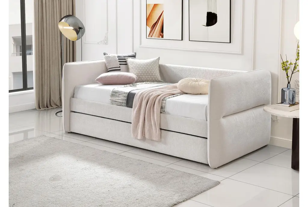 The Evie White Twin Upholstered Daybed with Trundle is a perfect blend of modern style and functionality. Its pearl-colored fabric upholstery adds a touch of elegance to any bedroom, while the trundle design provides an additional sleeping space. Ideal for minimalist and Scandinavian-inspired interiors, this daybed offers both comfort and versatility.