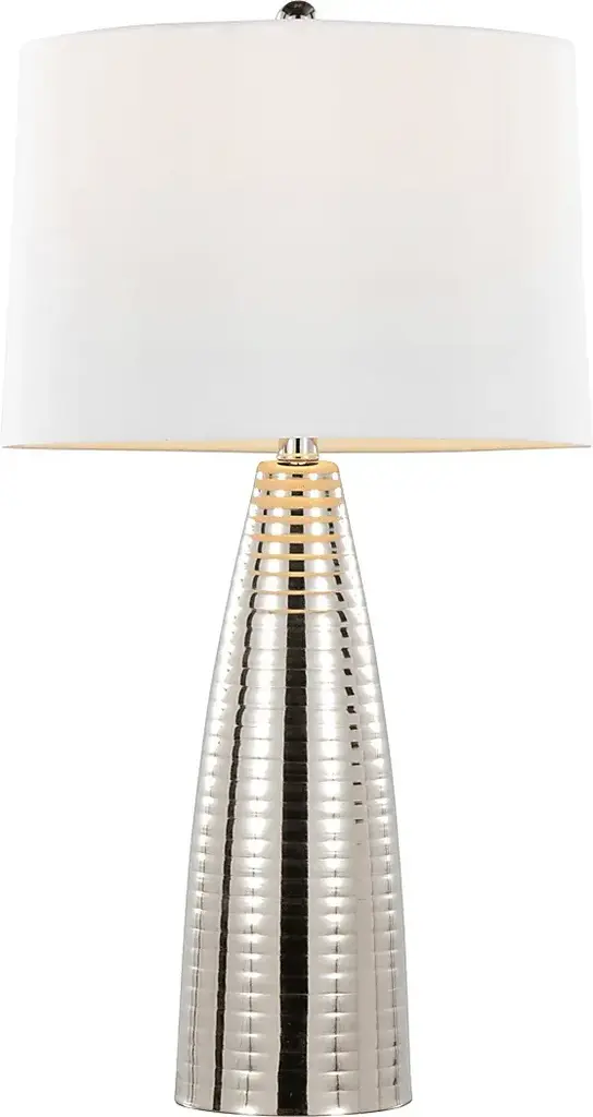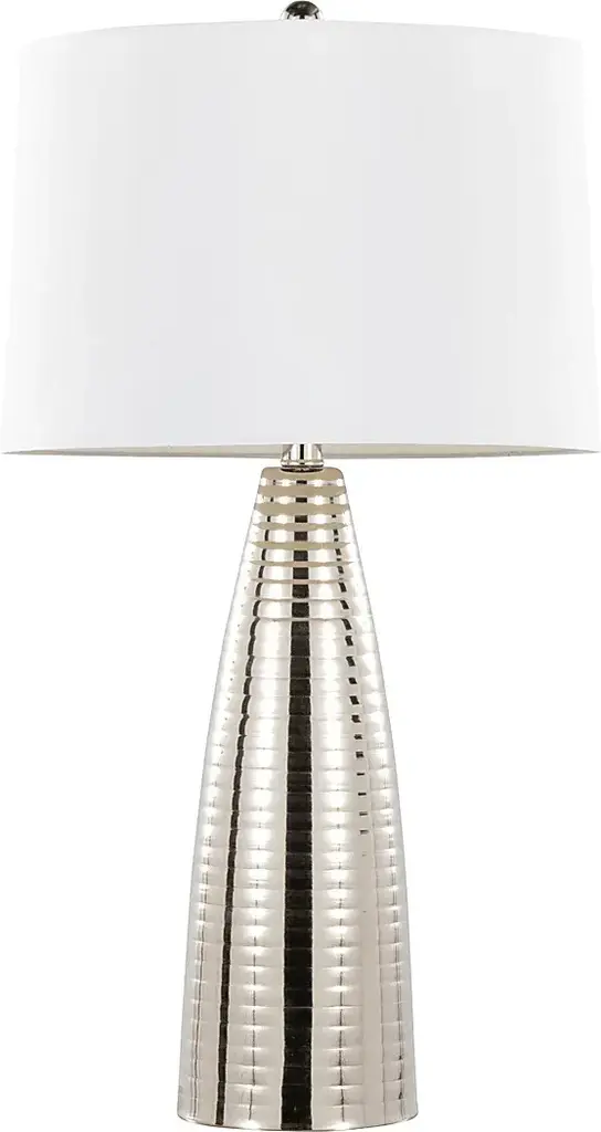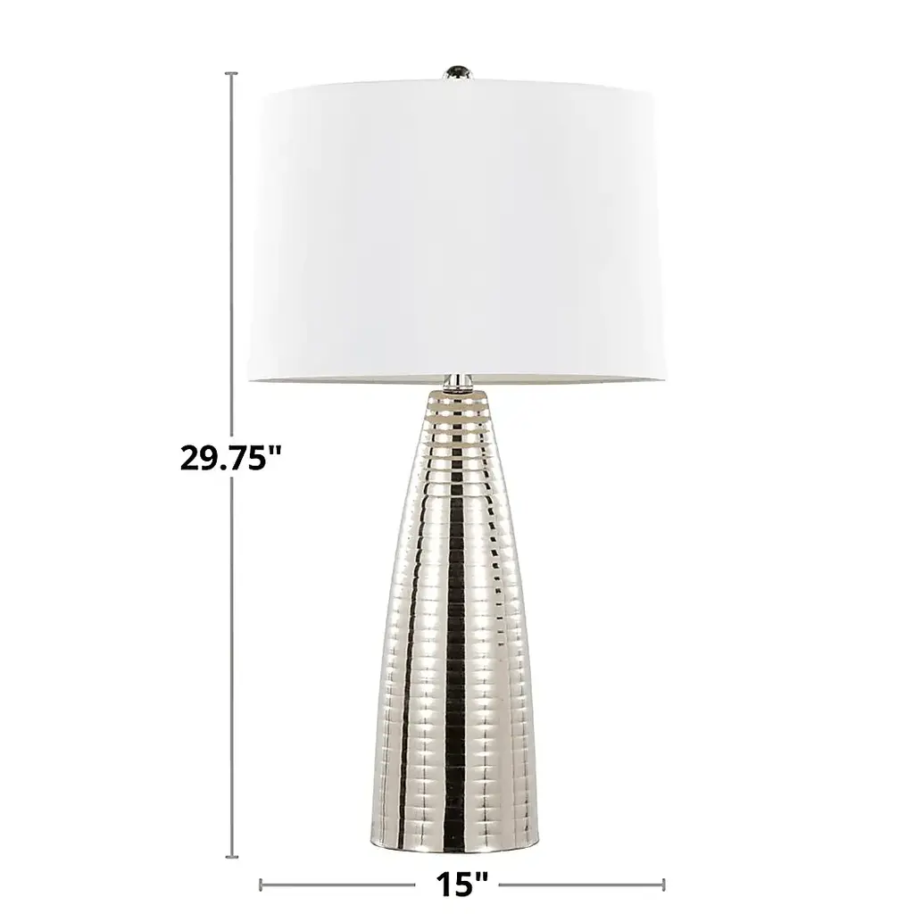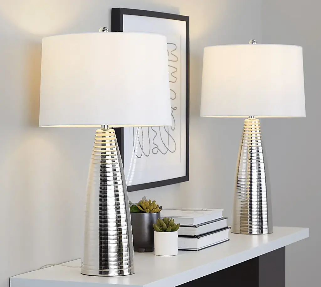 Give your living room or hallway some contemporary glam style with the Ewald Shade Silver Lamp, Set of 2. These beautiful lamps have a rounded bullet shape that builds upwards rib by rib for a distinctive texture that adds a luxe appearance to your space that is crowned with a complimentary tapered linen drum shade. Partial assembly may be required.