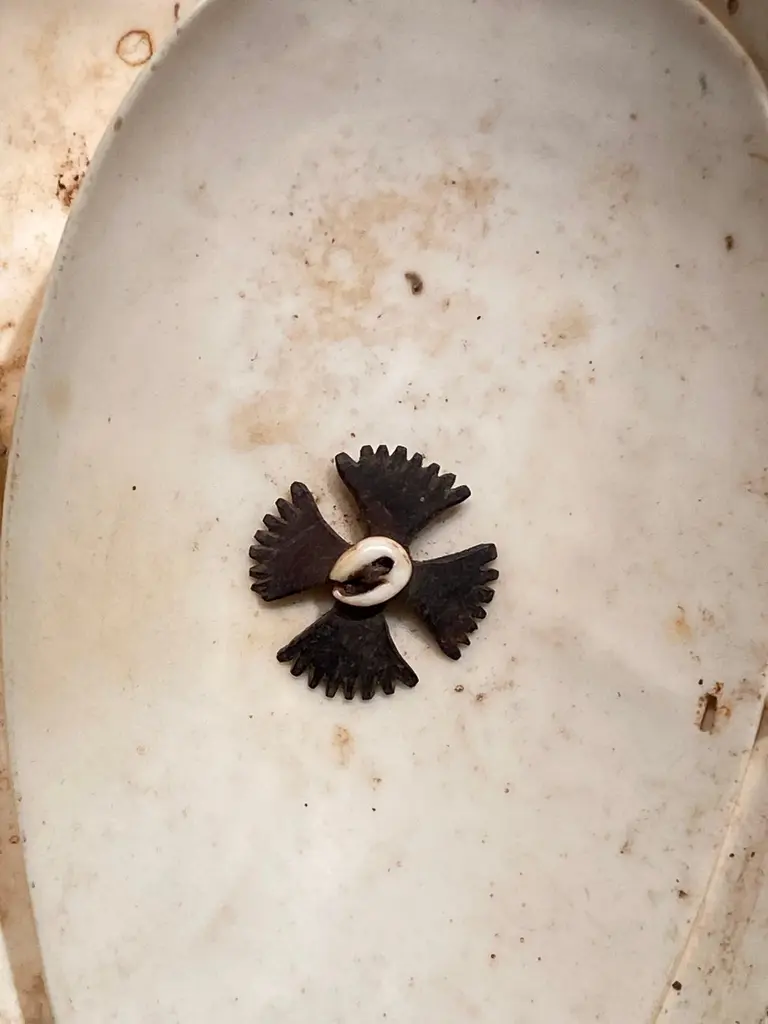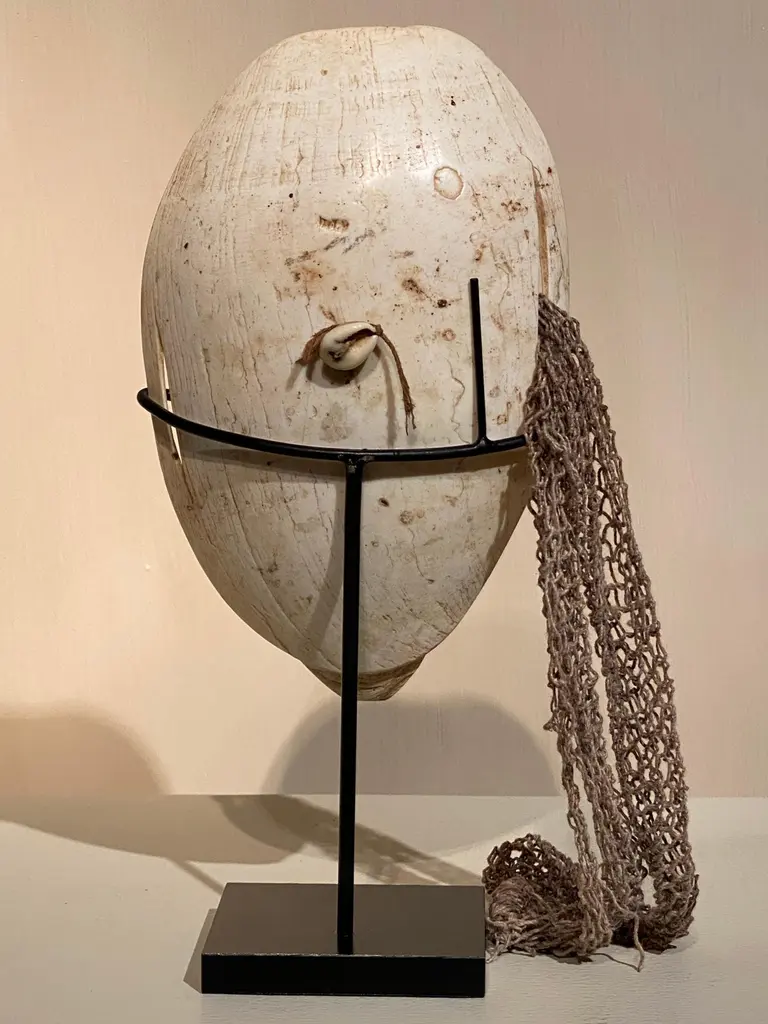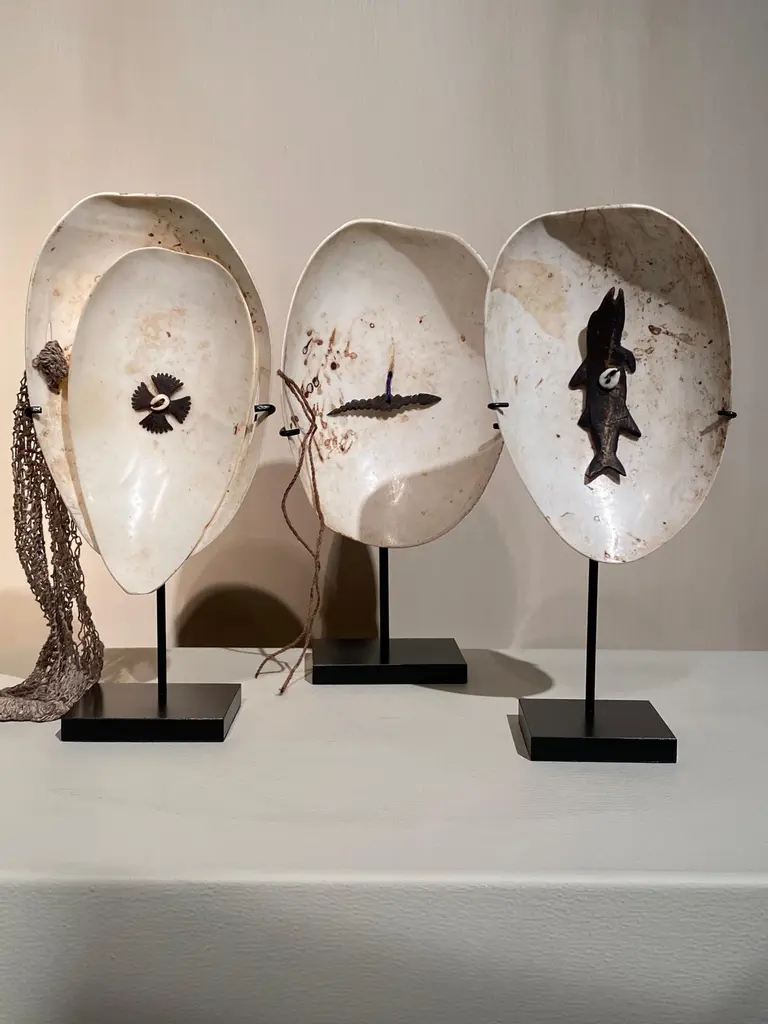 An exceptional set of 3 Shell objects from Papua New Guinea,made as ornaments used in the hair or as decoration of the body,decorated with hand carved figures made out of coconut or wood,small shells and fibres,good patina and shine of the shells, warm color,very decorative set24 cm high x 12 cm wide x 6 cm deep23 cm high x 10 cm wide x 6 cm deep24 cm high x 11 cm wide x 6 cm deep