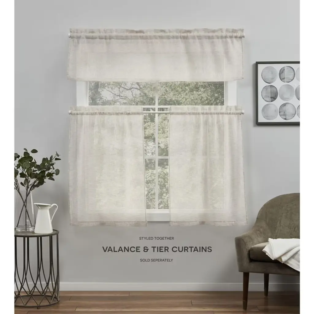 The Belgian sheer tier curtain panels by Exclusive Home are made with a lightweight and airy, linen-like fabric that allows light to flow through your space. This curtain panel set works perfectly for small windows in your kitchen, foyer, closet, or bathroom. The rod pocket top fits up to a 1/2" diameter curtain rod for easy hanging. Coordinate with our Belgian Tailored Valance and Belgian curtain panels or used on its own (sold separately). Machine washable for easy care.