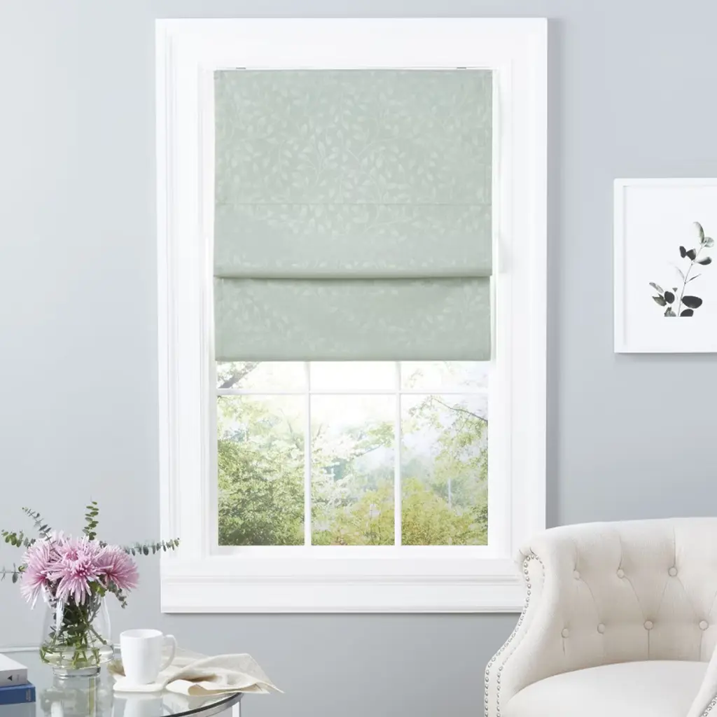 The Exclusive Home Curtains Bolan Botanical Total Blackout Roman Shade in sage features a tonal jacquard leaf pattern on high-quality, silk-look fabric and offers an elegant addition to your windows. This cordless shade has a foam blackout backing provides maximum privacy and blocks sunlight. A handle makes it easy to pull it up and down. The classic design is easy to coordinate with any decor style. Hang the shade in your living room, dining room, kitchen, office, bedroom, or entryway.