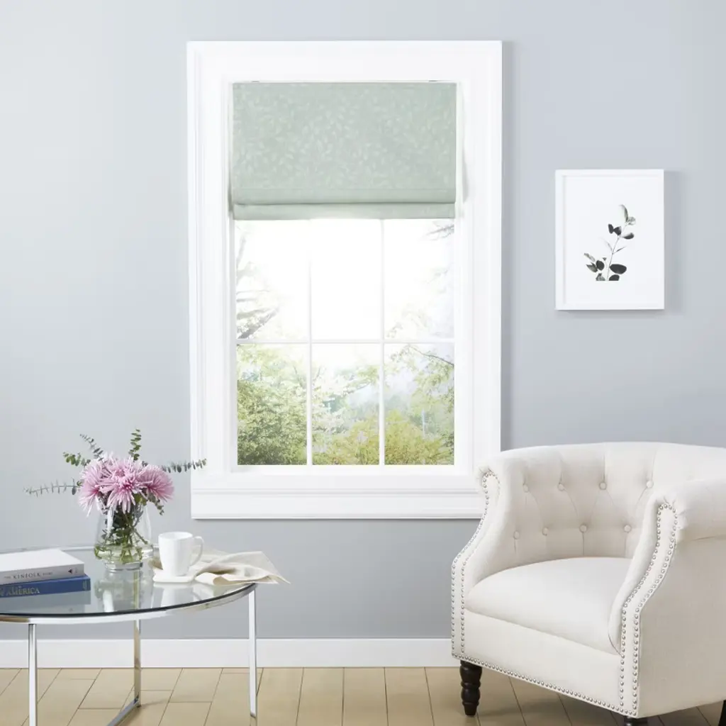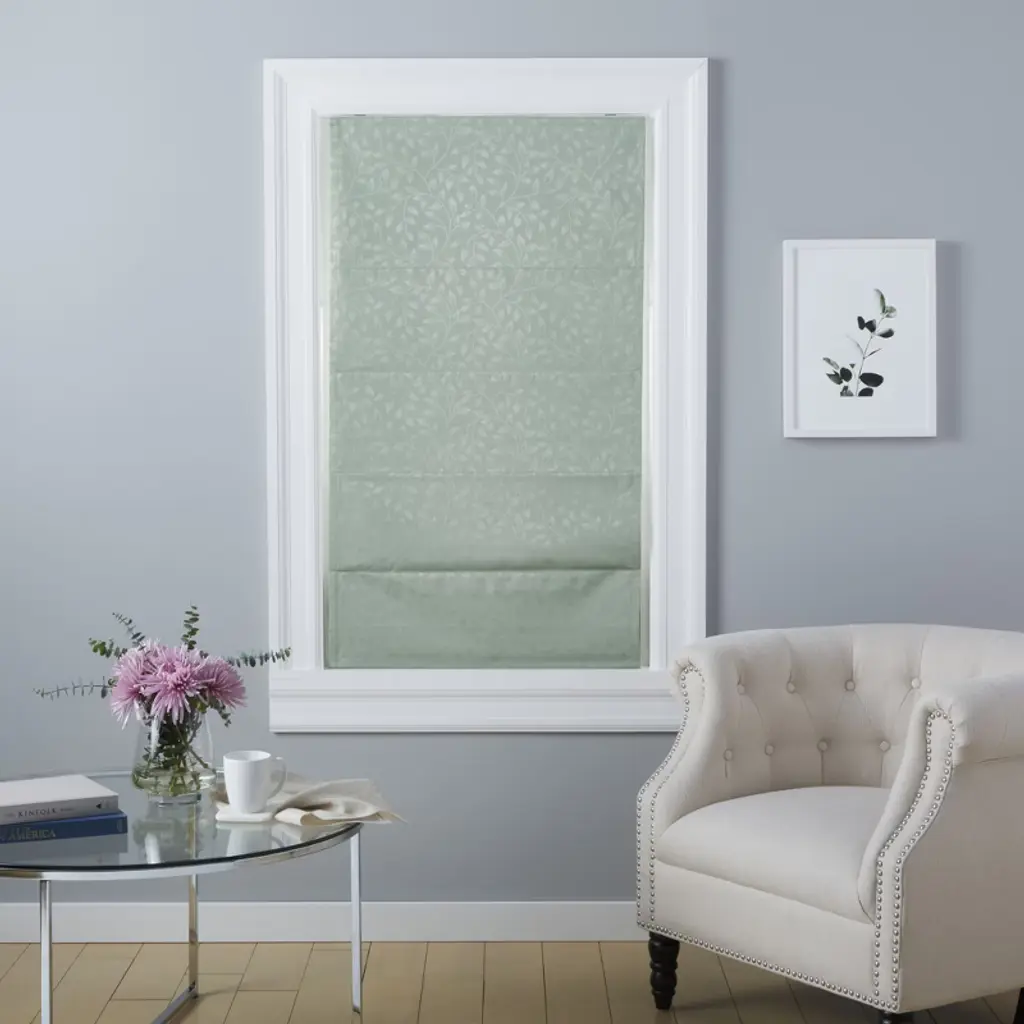 The Exclusive Home Curtains Bolan Botanical Total Blackout Roman Shade in sage features a tonal jacquard leaf pattern on high-quality, silk-look fabric and offers an elegant addition to your windows. This cordless shade has a foam blackout backing provides maximum privacy and blocks sunlight. A handle makes it easy to pull it up and down. The classic design is easy to coordinate with any decor style. Hang the shade in your living room, dining room, kitchen, office, bedroom, or entryway.