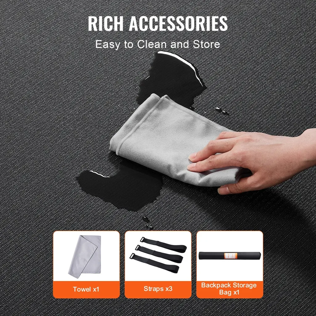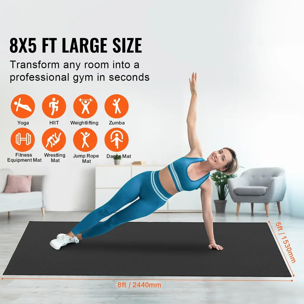 Professional Home Gym: The exercise mat features a large 8x6ft/8x5ft/7x5ft/10x6ft design, suitable for 2-3/1-2/3-4 people. Simply unroll and spread out the mat to turn any room in your home into a professional home gym. You can perform yoga, HIIT, aerobics, dance workouts, including P90x, Insanity, T25, Zumba, TRX, kettlebell exercises, jump rope, and various other exercises. Anti-slip and Durable: The exercise yoga mat is made from high-density PVC material weighing 2800g/㎡. Its surface is anti-slip and wear-resistant, ensuring it remains intact even after prolonged use. The dense circular texture on the bottom provides extraordinary grip stability, preventing the mat from slipping and helping you avoid falls during workouts. Protects Your Floor and Joints: The 0.28"/7mm thick exercise mat effectively protects your carpet or hardwood floors from scratches. The high-density thick mat offers excellent cushioning, combining support and softness to protect your joints from injury during exercise. Easy to Clean and Store: The thick yoga mat includes a soft, highly absorbent fiber towel, a storage bag, and 3 straps. After each use, it is easy to clean and wipe down the mat, roll it up for storage, and transport it conveniently. Suitable for Various Uses: Our fitness & exercise mat is suitable for all floor types, including carpets, tiles, or wooden floors in living rooms or bedrooms, as well as concrete floors in garages, patios, or basements. It can be used as a play mat, floor mat, equipment mat, or exercise mat. Package Content 1 x Exercise Mat 1 x Backpack Storage Bag 3 x Straps 1 x Towel