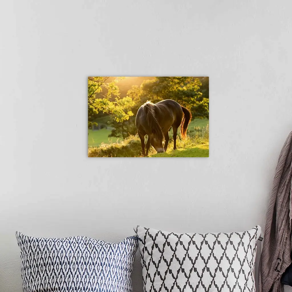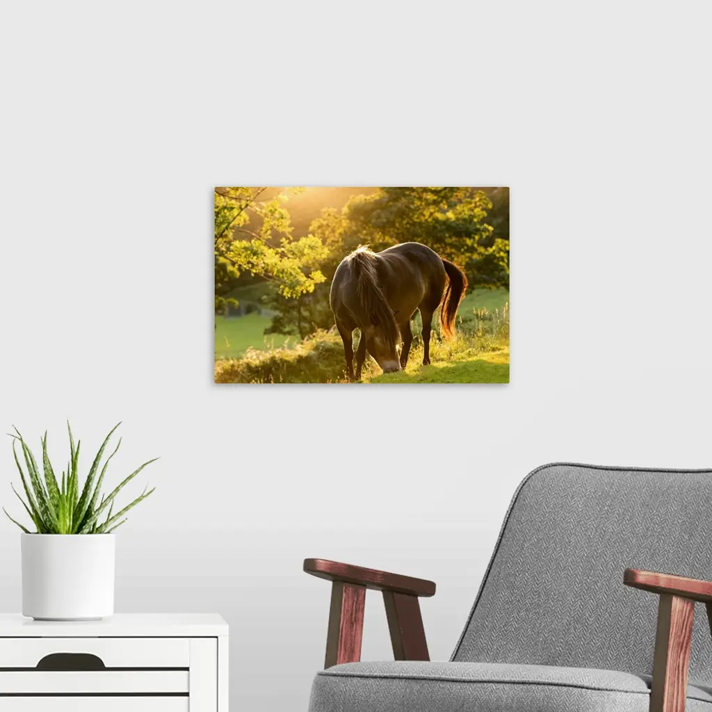 A pony grazing on a hill at sunset.
