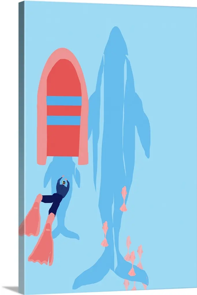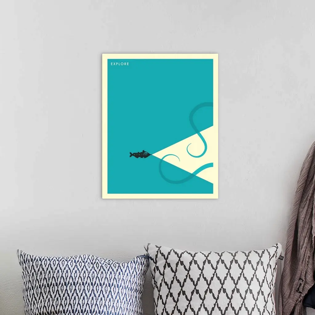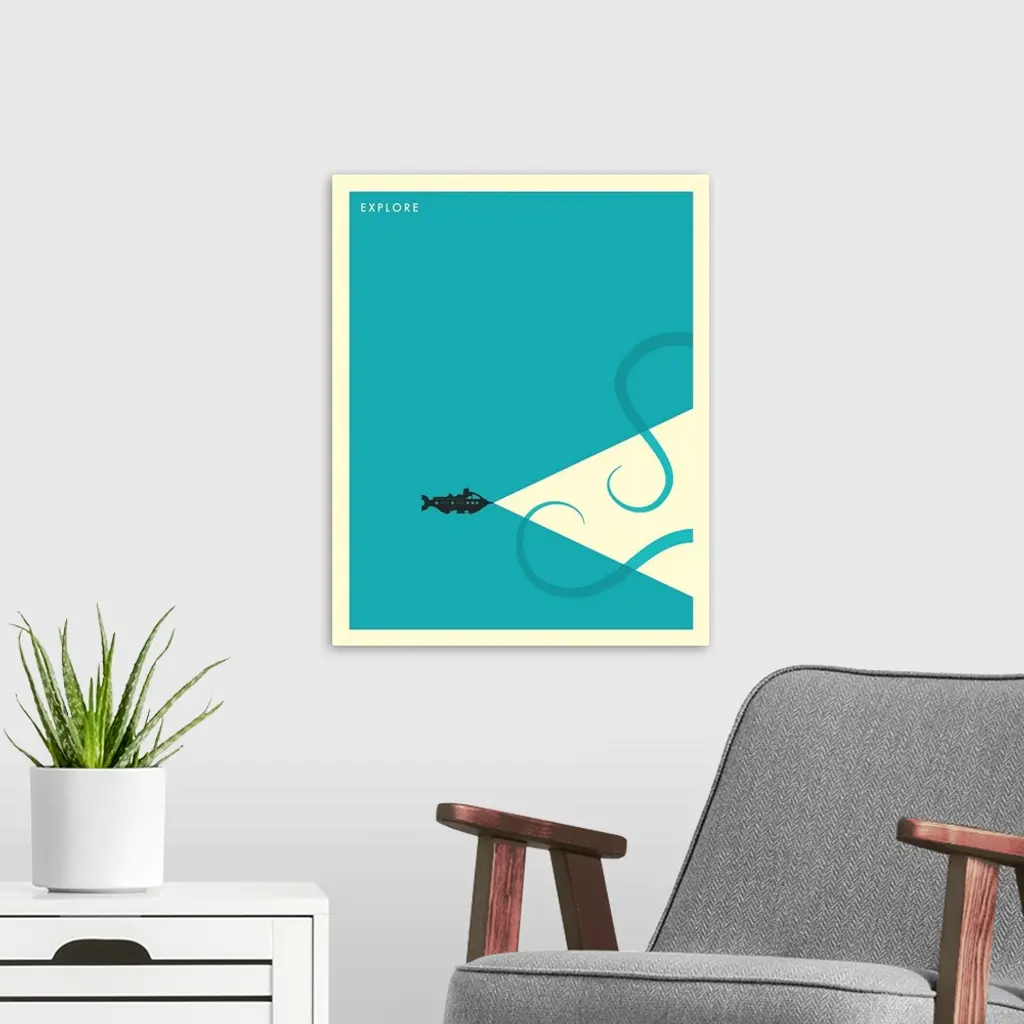 Minimalist illustration of a submarine shining a white light towards two octopus tentacles, and the word "Explore" written in the top left corner, all on a bright blue background.