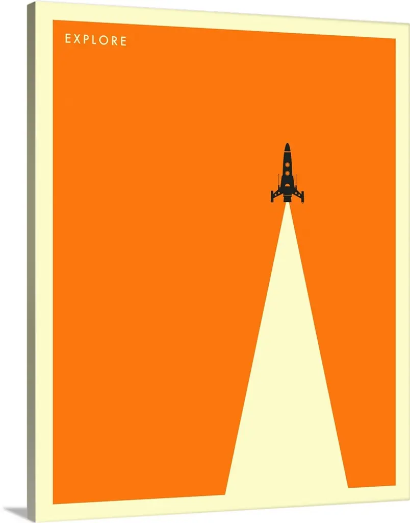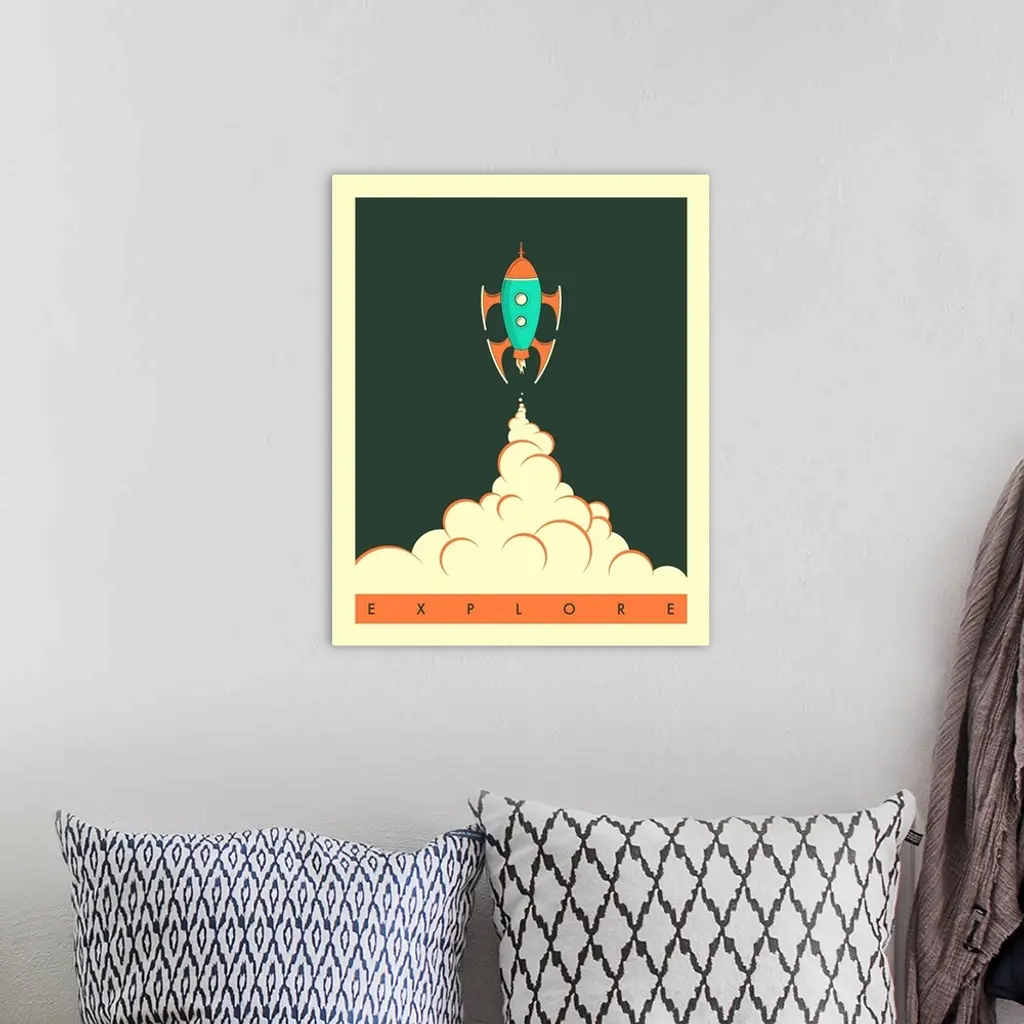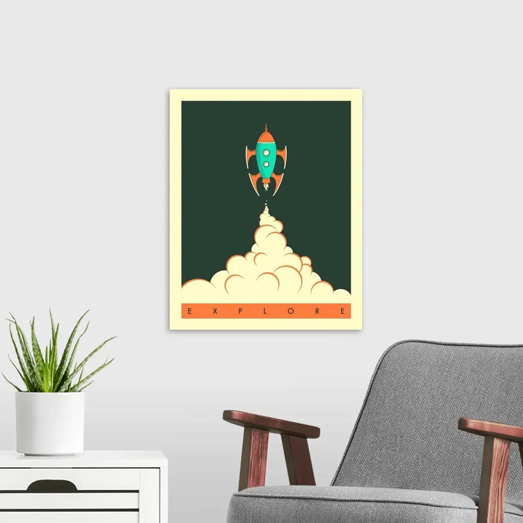 Illustration of a rocket taking off and leaving a cloud of smoke behind, with the word "Explore" written across the bottom.