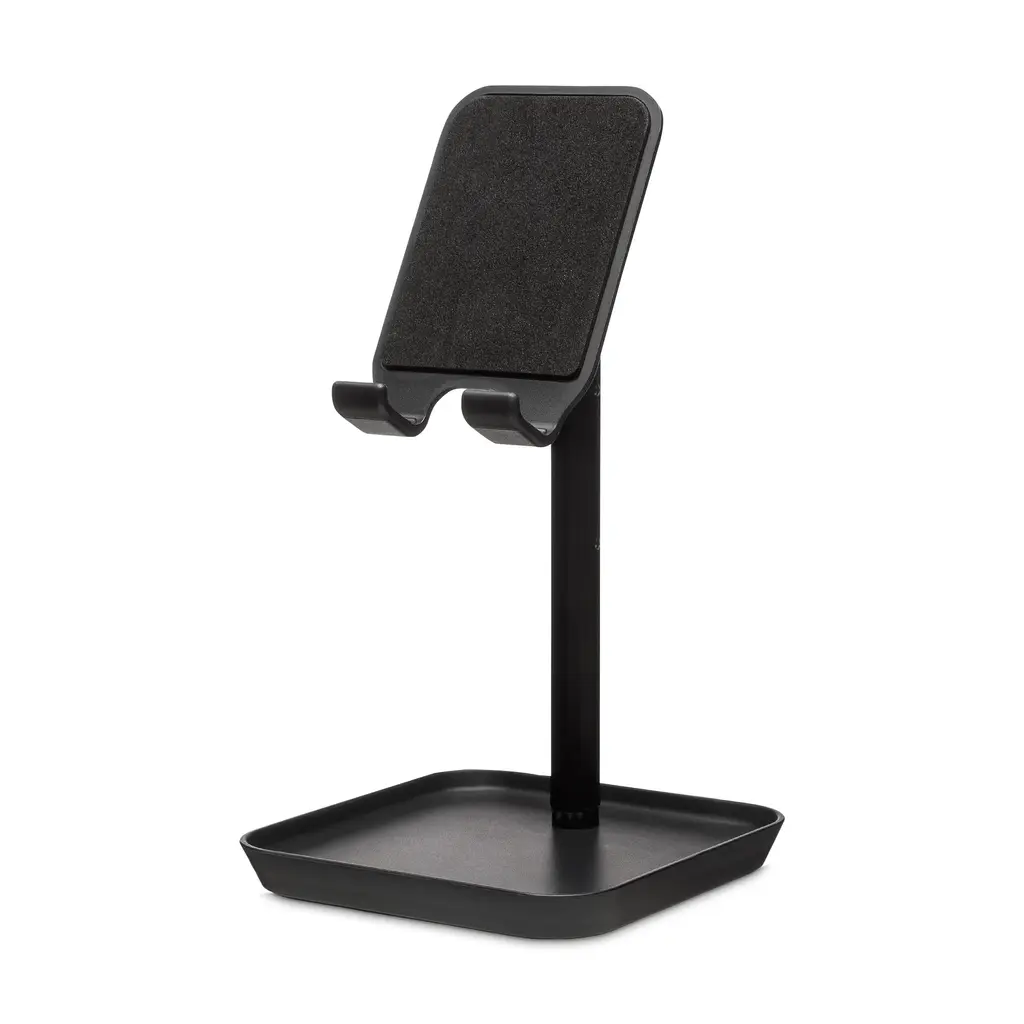 Access apps and make video calls more ergonomically with the Extendable Phone Stand, a sturdy stand designed to let you place and use your smartphone or tablet at a comfortable viewing height on your desk or table. The incorporated tray is useful for holding earbuds, USB cables and small office items. Features of the Extendable Phone Stand include: Three adjustable heights range from 7.25 to 9.75”h. Viewing angle can be adjusted from 0 to 45 degrees. Can be used with smartphones and small tablets. Made of ABS plastic, aluminum and silicone. Stand has a non-slip bottom for stability. Measures 7.25h x 4w x 4"d.
