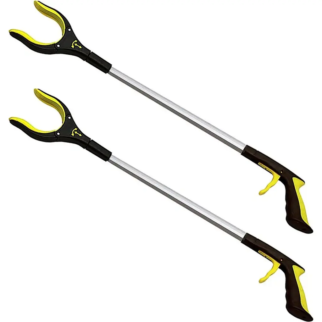 WHAT IS INCLUDED: 2 Packs of 32" grabber reacher with rotating jaw. 32" LONG: Increases your reach by 32 inches so that you can pick up items from floor, top shelf, outdoor lawn, trash can, behind furniture, or other hard to reach places. ROTATING JAW: The jaw rotates and locks at 90 degrees for vertical or horizontal use. It is made from soft rubber to allow picking up the smallest items with ease. DURABILITY: The shaft is made from rust-proof lightweight aluminum and the internal wire is made from steel cable for durability and easy of use.