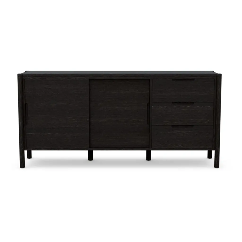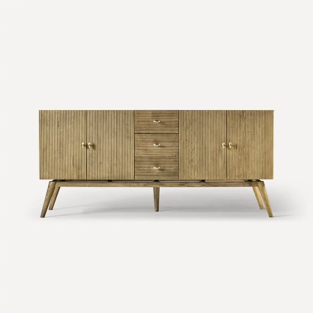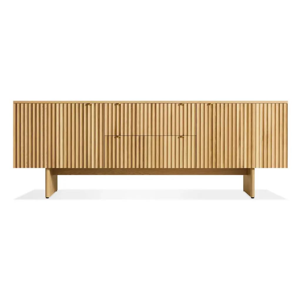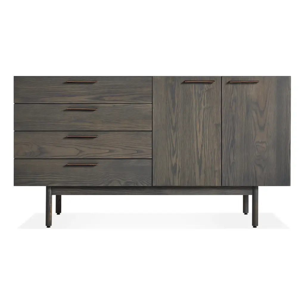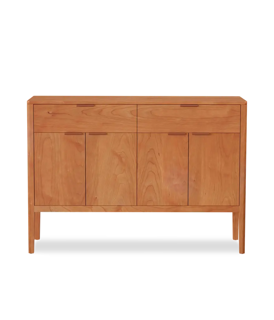 Our warm brown TV cabinet combines refined mid-century modern styling with the storage space a contemporary home media setup requires. Designed to hold a 60-inch flat-screen TV, it features two doors that open to reveal spacious, adjustable shelves, and three drawers for accessories, plus a cord management system.