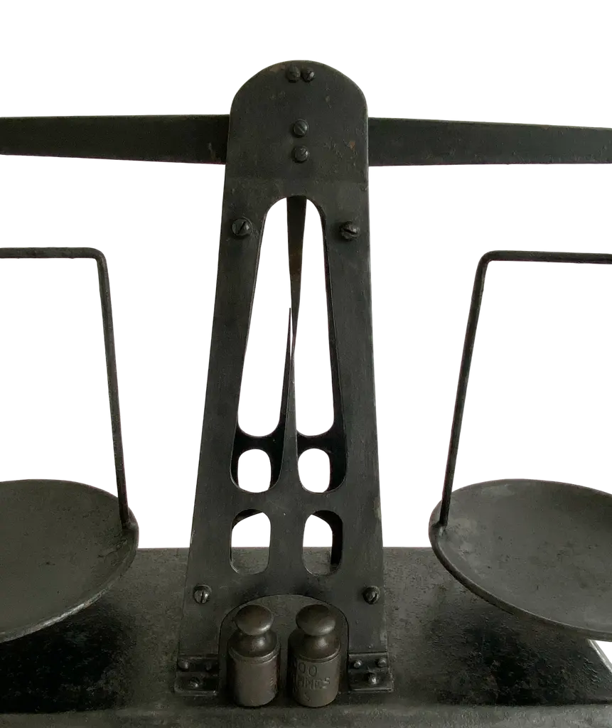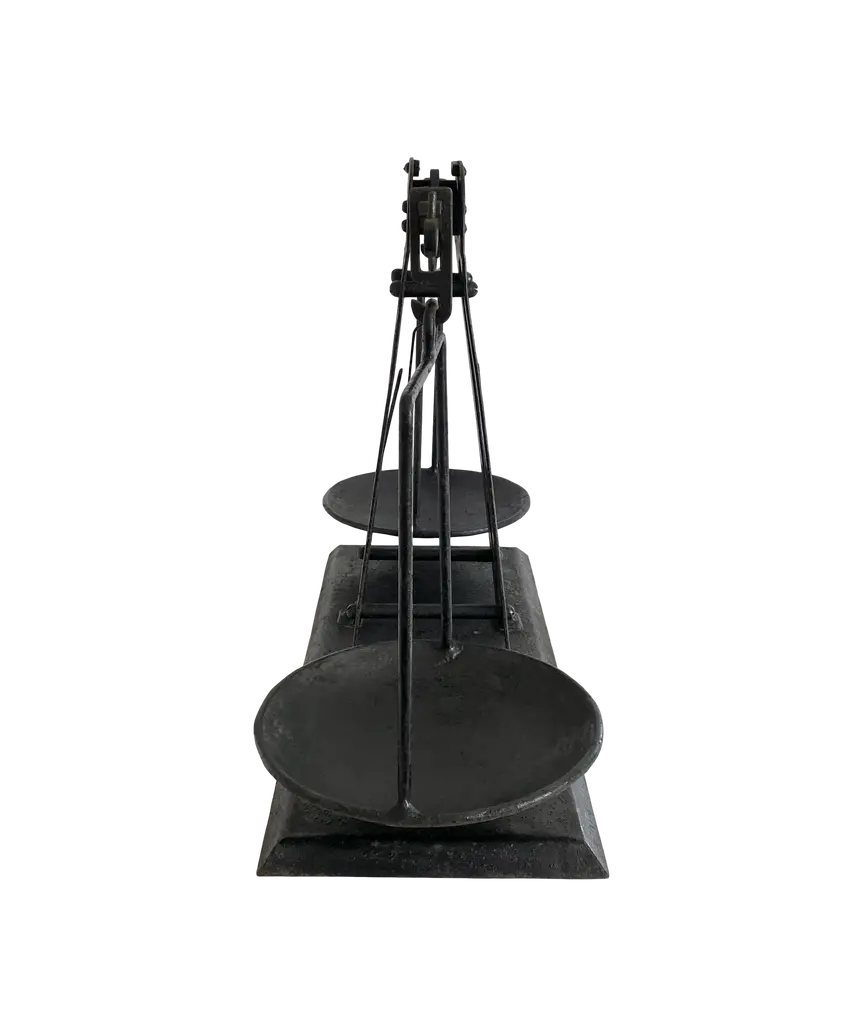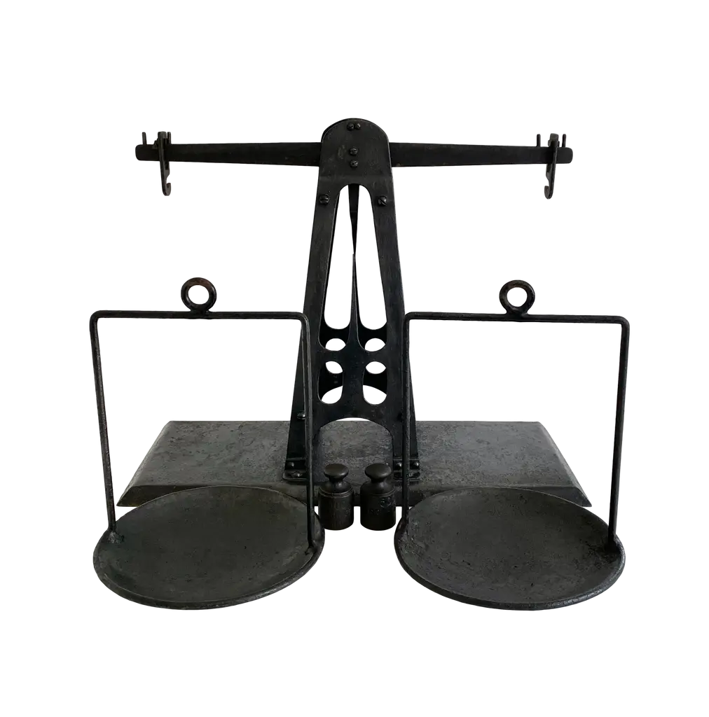 Extraordinary statement size antique French balance scale with a black patinized finish. May have been used for assaying purposes. Two 500 grammes weights included.