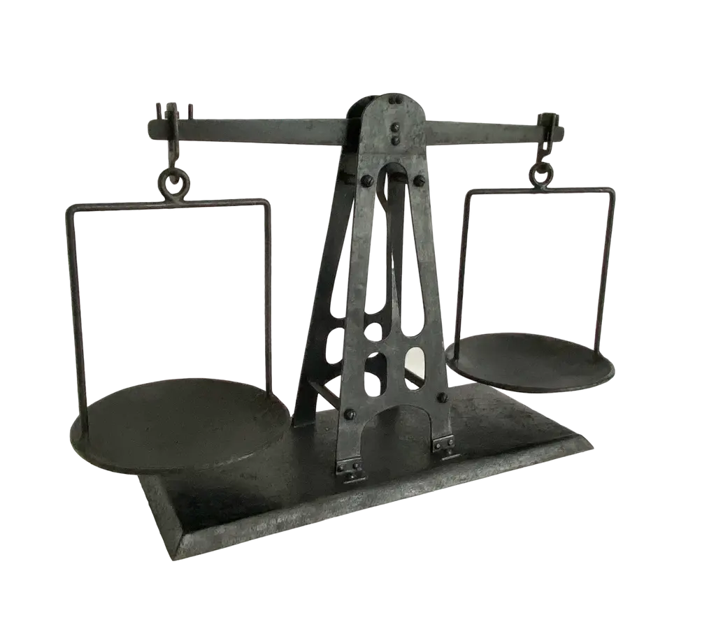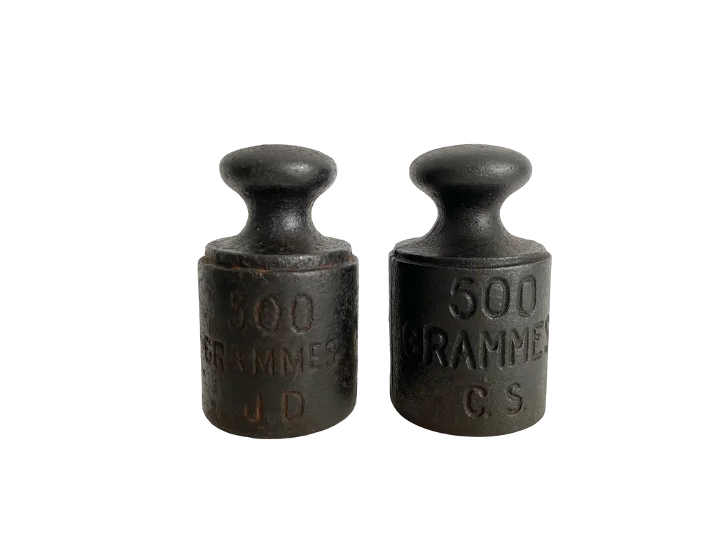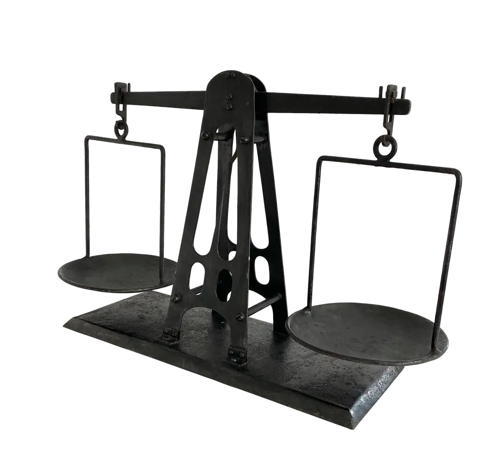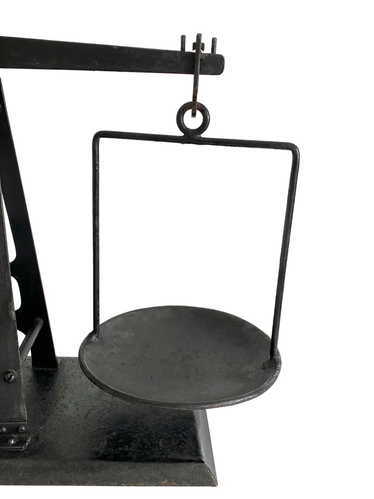 Extraordinary statement size antique French balance scale with a black patinized finish. May have been used for assaying purposes. Two 500 grammes weights included.