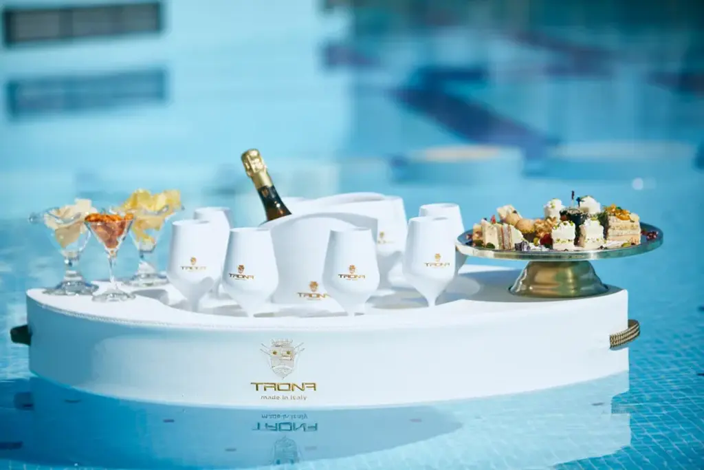 Eye Bar is a small floating bar designed for cocktail parties on the water.With its unique eye shape, the floating bar has two spaces on the sides for holding appetizers or other items. Thanks to the special perforated plexiglass panel, the floating bar safely holds bottles with ice buckets and glasses without spilling them.This product maintains its quality over time, and thanks to its certified white eco-leather upholstery and nautical rope handles, the Eye floating bar is a functional accessory both in and out of the water.The Trona collection is based on the original design by Italian designer Christian Tamburinelli, who created this collection of floating furnishings for spas, wellness centers, and yacht clubs. The collection is entirely comprised of unique, luxurious pieces, perfect for both in-water and elegant living spaces above water. The products in the line are all certified in Italy for their originality and functionality, as durable, long-lasting furnishings. Each piece is customizable in color and materials to suit any space, both indoors and out.
