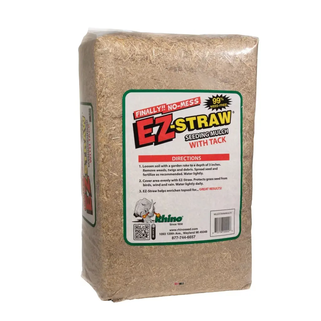 EZ-STRAW Seeding Mulch with Tackifier is the perfect add-on solution for planting grass seed. It contains processed wheat straw and tackifier, a natural powder used in hydro seeding that sticks together when wet. Packaged in a convenient, UV-protected poly bag allows for outside storage. Won't leave a customer's vehicle with an impossible mess to clean. Easy to handle package works great for small and large areas. For every 5 lbs. to 7 lbs. of grass seed spread, use 2 bales of EZ-STRAW Seeding Mulch.