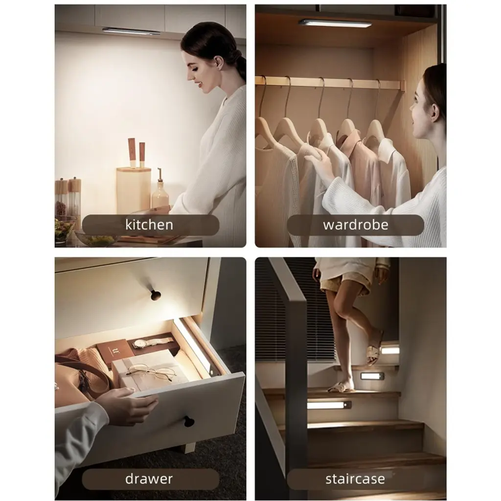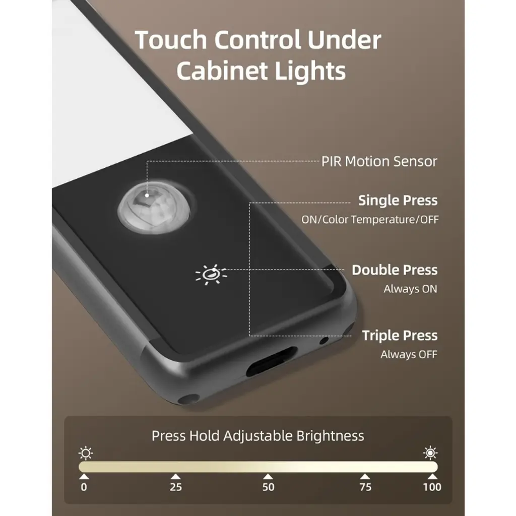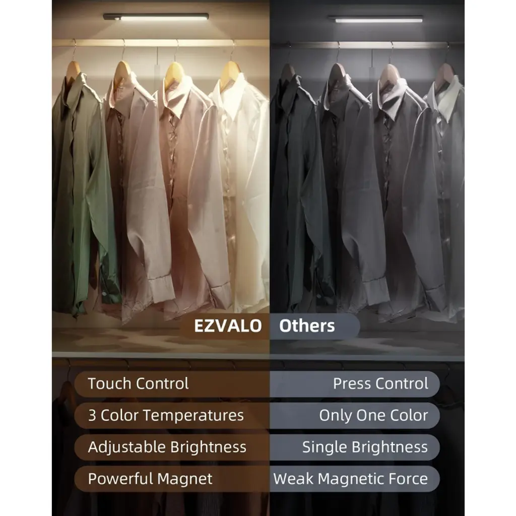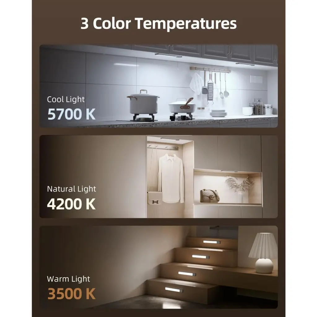 EZVALO 11.8in motion sensor under cabinet lights offer adjustable brightness and three color temperatures. Perfect for closets, cabinets, or any dark space, they provide energy-efficient, hands-free lighting when needed.
