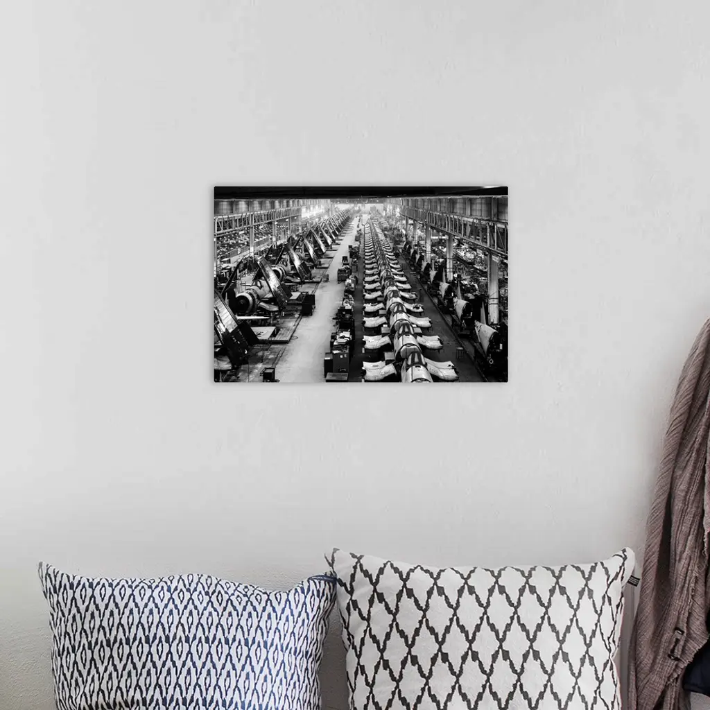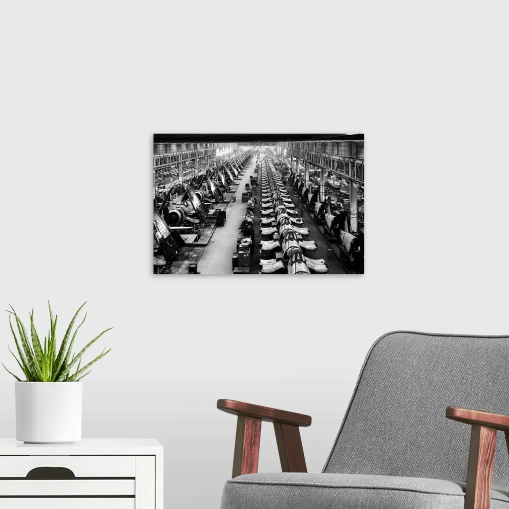 Airplane factory in Stratford, Connecticut, World War II, which produced over 6,000 Corsairs- fighter planes with fold-up wings for use on board aircraft carriers.