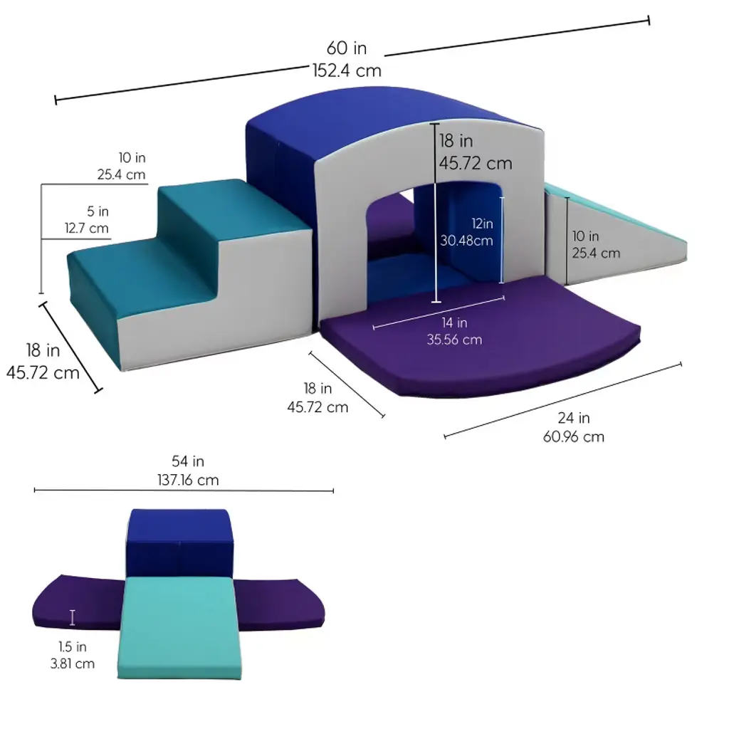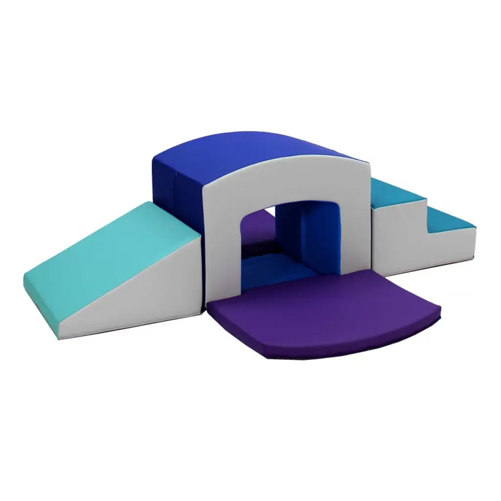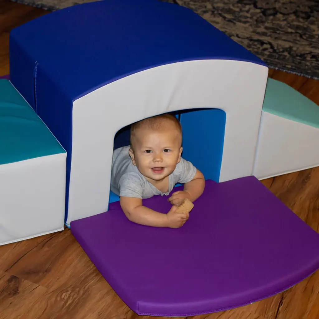 Explore new heights with the all-in-one Toddler Playtime Tunnel Climber! Stimulate young imaginations and motor skills by encouraging hands and feet to explore up the soft steps, crawl across or under the sturdy tunnel and coast down the gentle slide. Tunnel is made of sturdy foam to support little ones as they venture up and over, while soft side pads add extra cushion as kids crawl through. Pieces can be rearranged to build different configurations to accomodate kids as they grow and develop new skills. Children should remove shoes before play to ensure product longevity.
