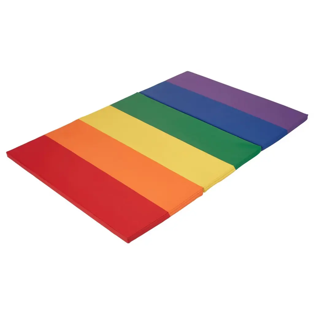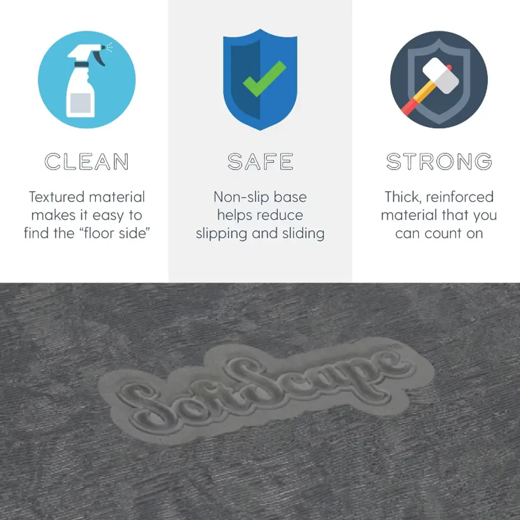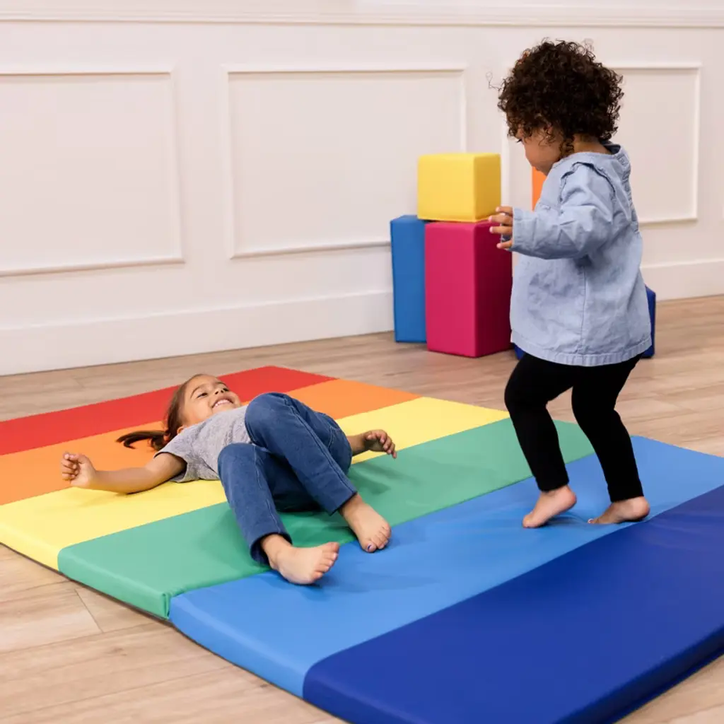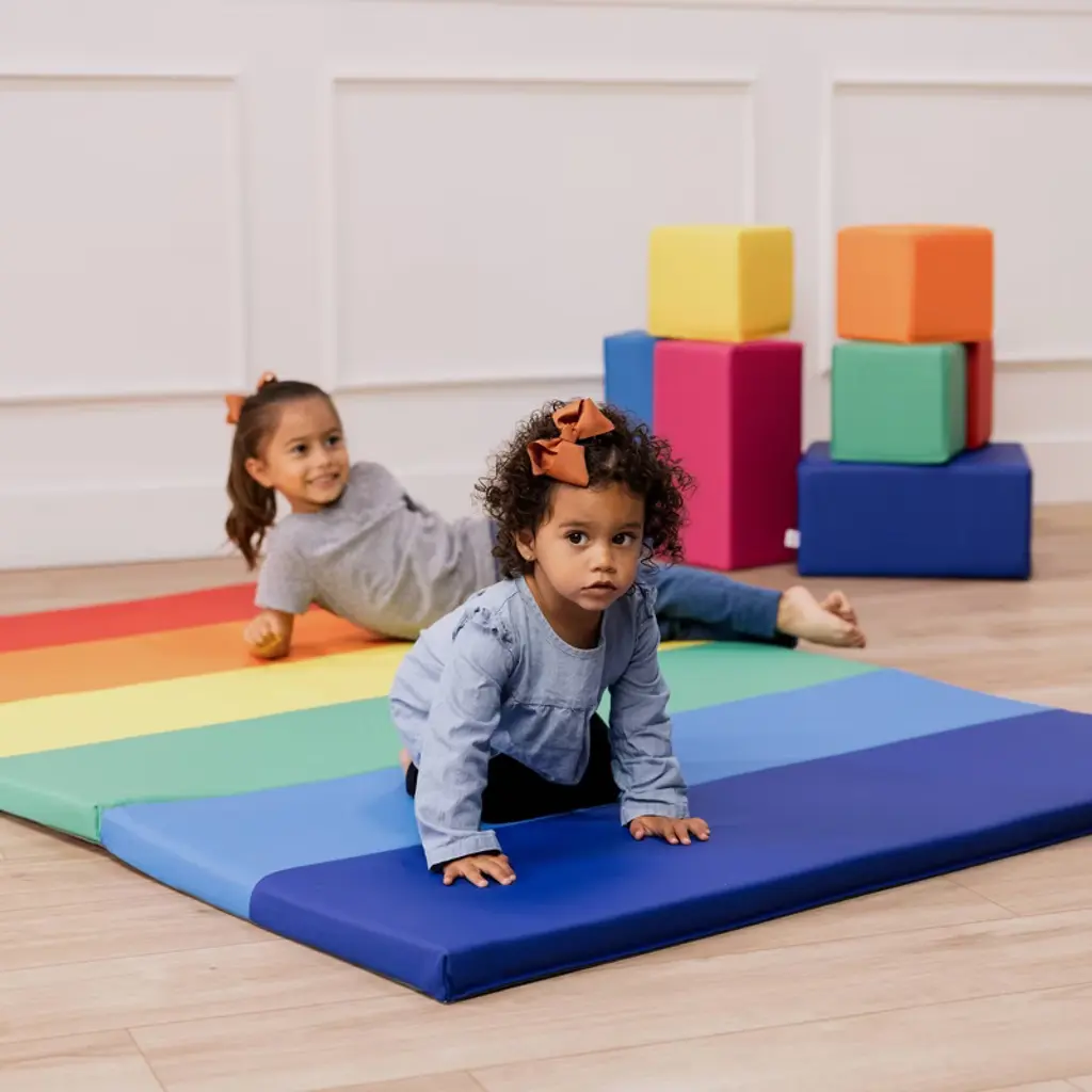 The SoftScape Space Saver Play Mat encourages motor skill development in preschools, daycares and home environments. Designed for smaller spaces, folding for compact storage and easy transportation. Encourages motor skill development in preschools, daycares and home environments.Non-slip bottom keeps mats in place. The sturdy 1.5 inch foam core is covered in a soft, yet durable polyurethane material. When dirty —just wipe clean with mild soap and water solution. Adult supervision required.