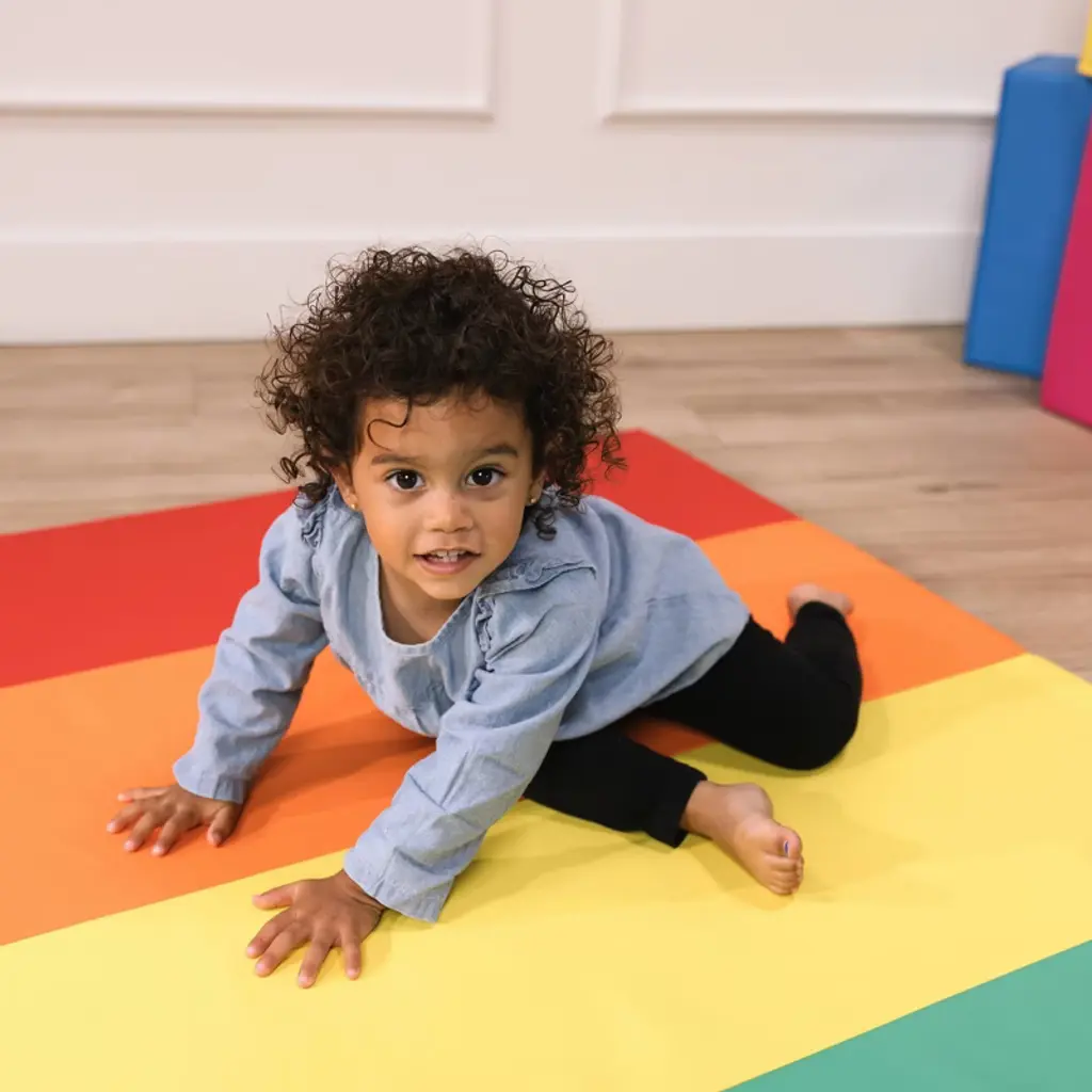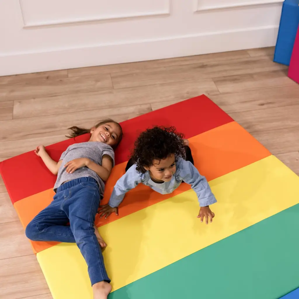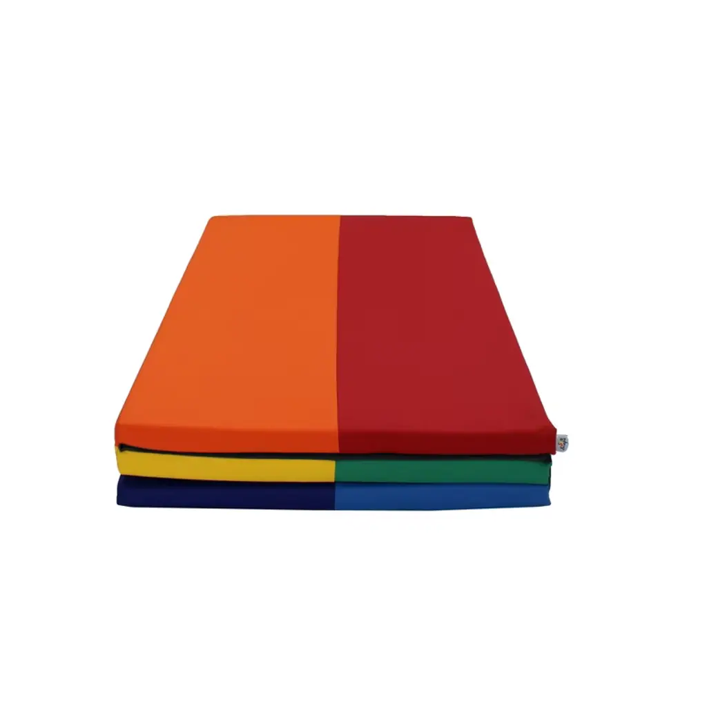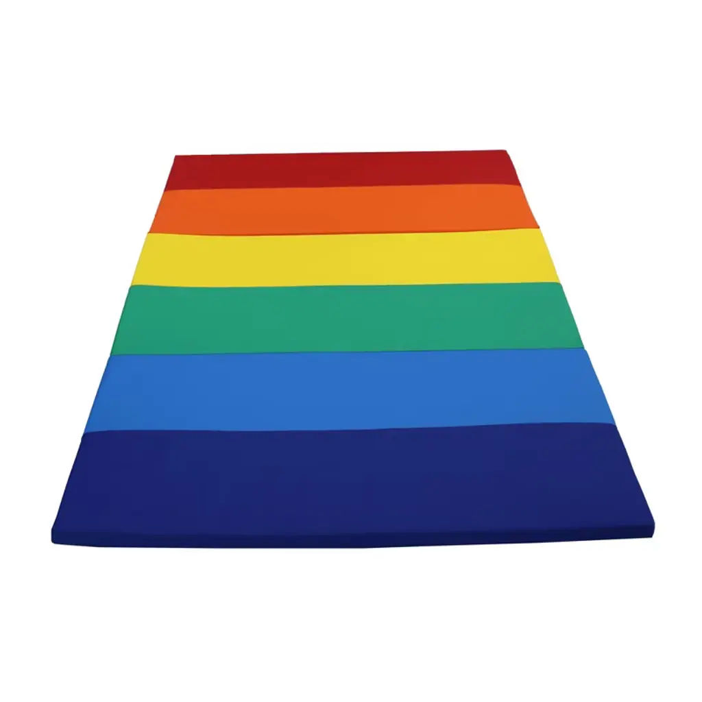 The SoftScape Space Saver Play Mat encourages motor skill development in preschools, daycares and home environments. Designed for smaller spaces, folding for compact storage and easy transportation. Encourages motor skill development in preschools, daycares and home environments.Non-slip bottom keeps mats in place. The sturdy 1.5 inch foam core is covered in a soft, yet durable polyurethane material. When dirty —just wipe clean with mild soap and water solution. Adult supervision required.