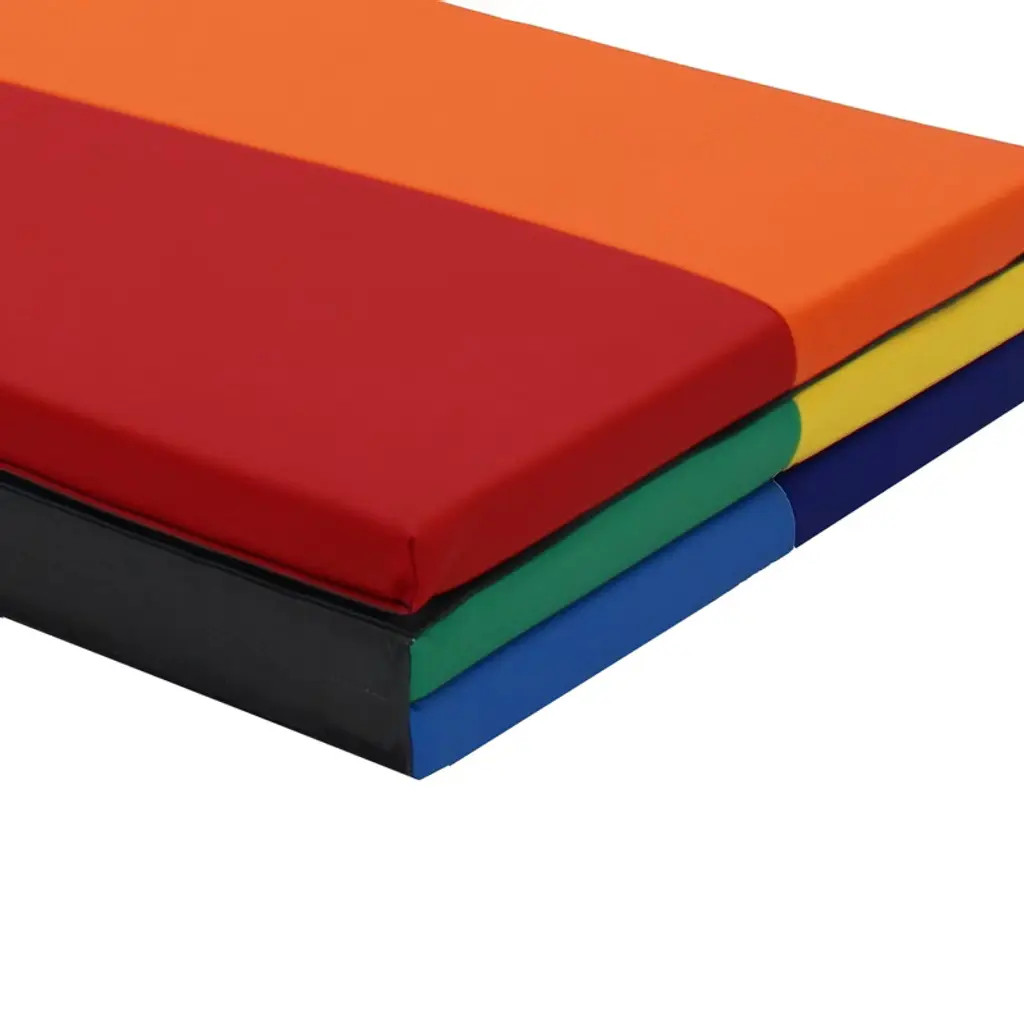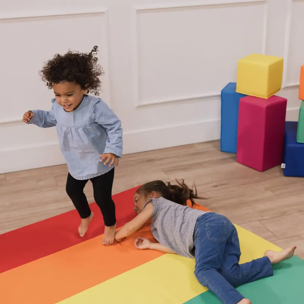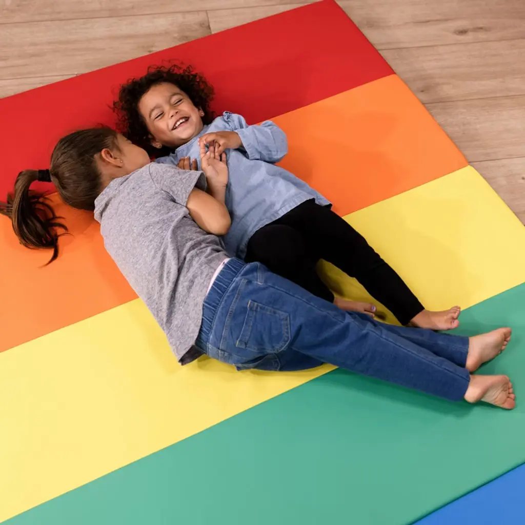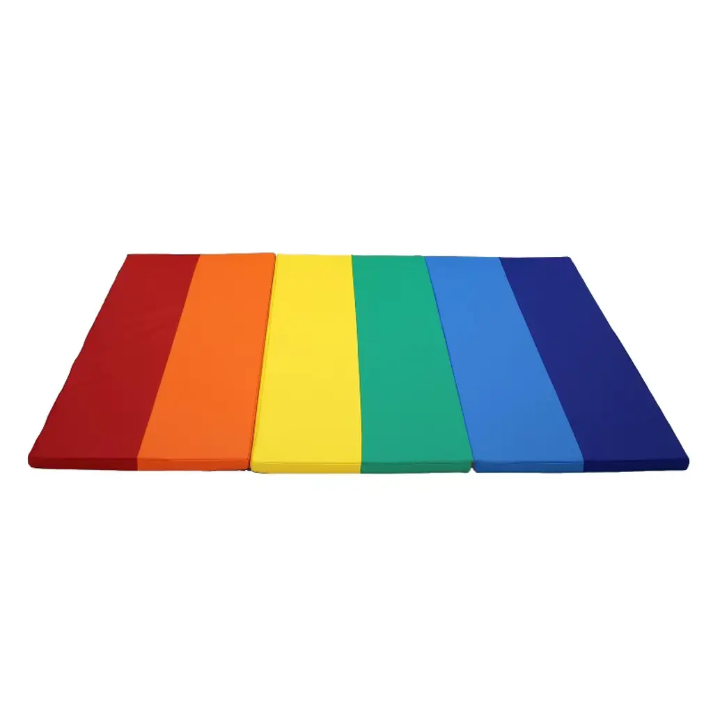 The SoftScape Space Saver Play Mat encourages motor skill development in preschools, daycares and home environments. Designed for smaller spaces, folding for compact storage and easy transportation. Encourages motor skill development in preschools, daycares and home environments.Non-slip bottom keeps mats in place. The sturdy 1.5 inch foam core is covered in a soft, yet durable polyurethane material. When dirty —just wipe clean with mild soap and water solution. Adult supervision required.