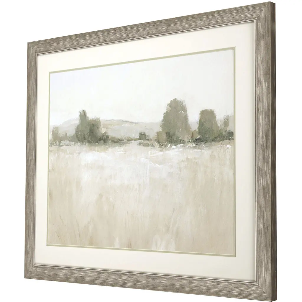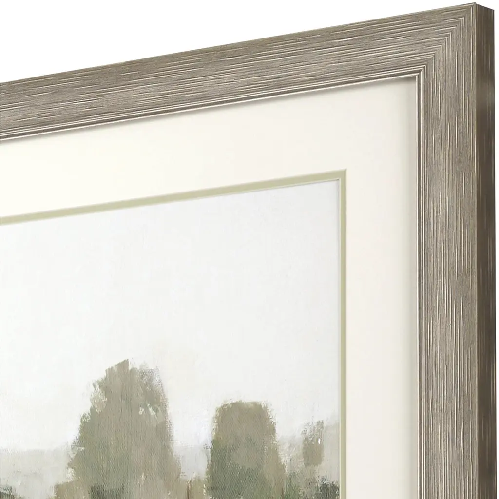 Soothing colors mark a distant tree line for a quite relaxing view. Matted in white and framed in a distressed silver finish moulding.