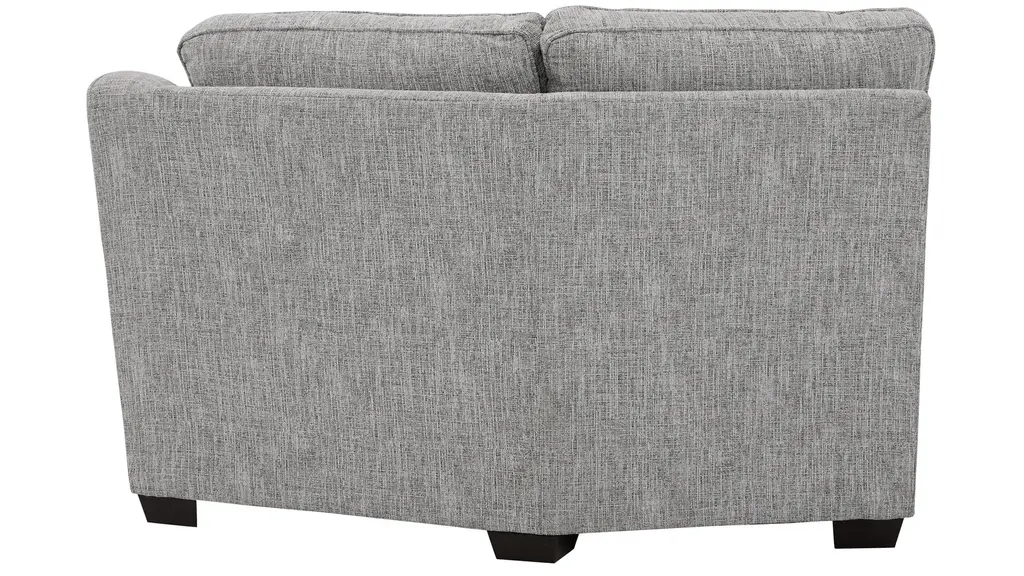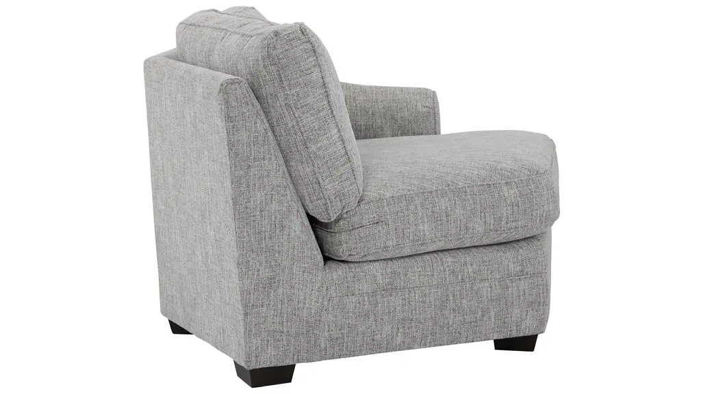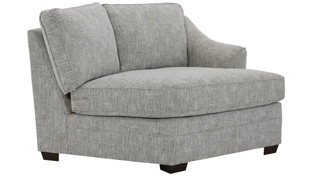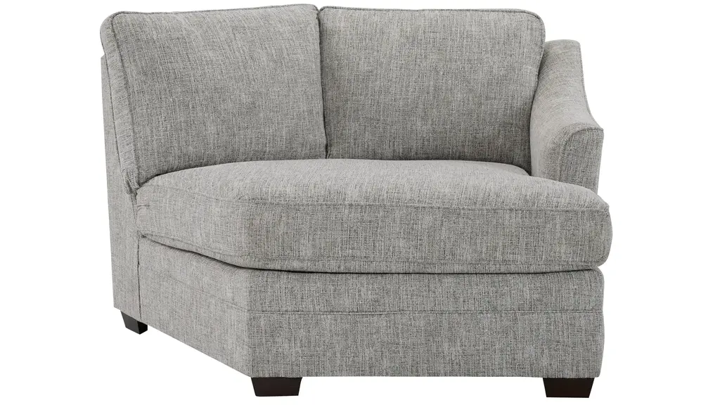 A standard sectional gets an upscale update in the Fairhaven collection, with options for conversation corners, chaise lounging, or both. Featuring a transitional style with cool neutral upholstery and sleek sloped arms, the Fairhaven cuddler is a key component of a sectional arrangement that's beautiful tucked in a cozy corner or featured as part of a defining focal point in an open concept living space. A striking textured accent pillow adds a dramatic pop of black and white for a designer touch.