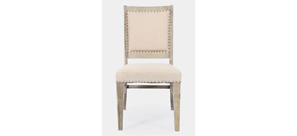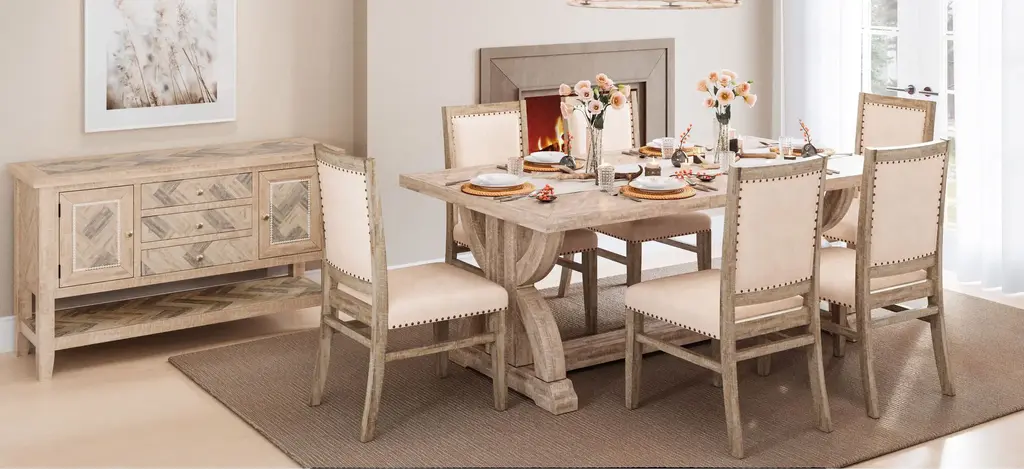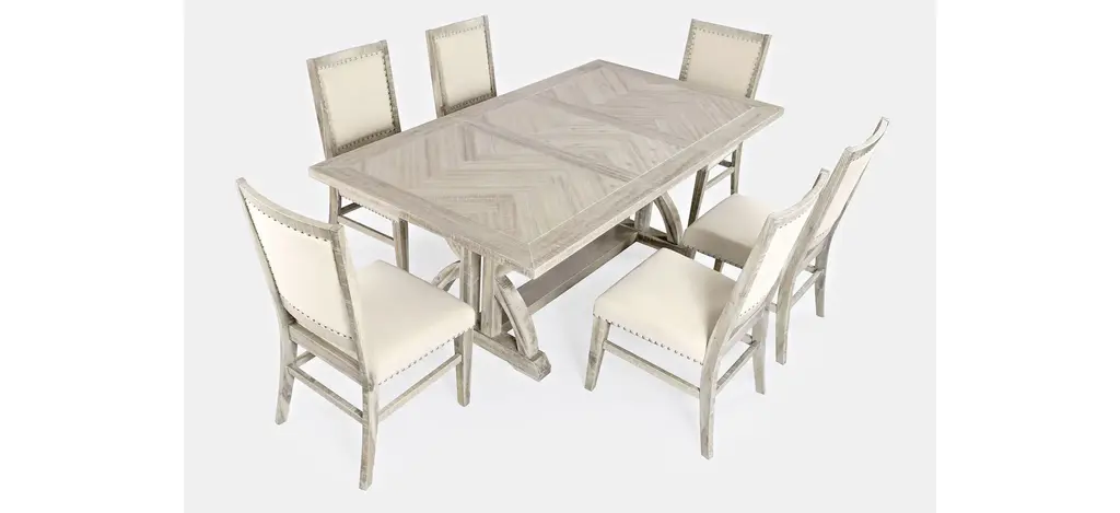 Timeless mid-century style with lush upholstery in a cream finish with hand-laid nailhead trim make this Fairview Dining Set a statement piece. This set includes one table with and extension, and six matching dining chairs. Solid acacia wood and beautiful veneer with subtle hardwood distressing on the legs and frame adds character and makes every piece one of a kind.
