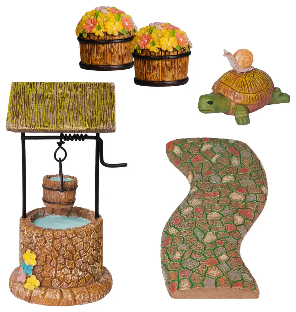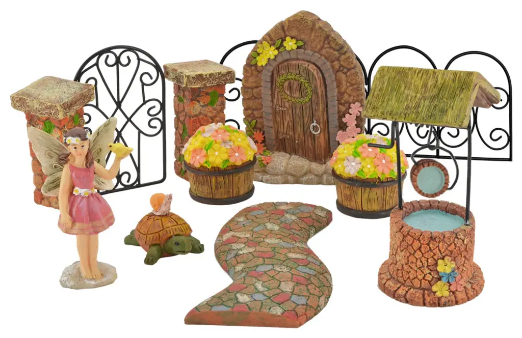 Fairy gardens inspire creativity! Easily design a miniature garden scene and step into a world of fantasy. This kit includes multiple handcrafted pieces carefully selected for quality and durability. Fairy Garden Kits make it easy for children and adults to design unique and delightful gardens. The possibilities are endless!