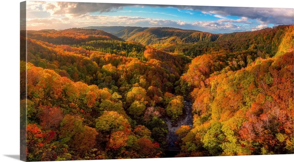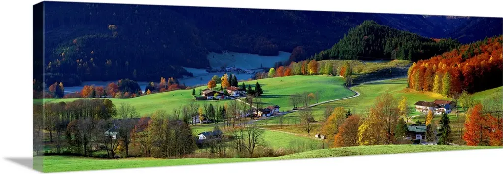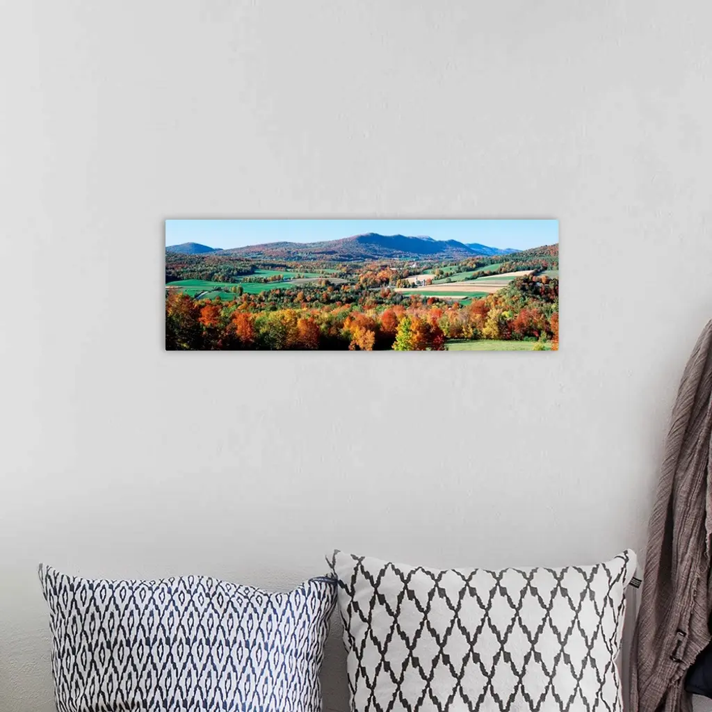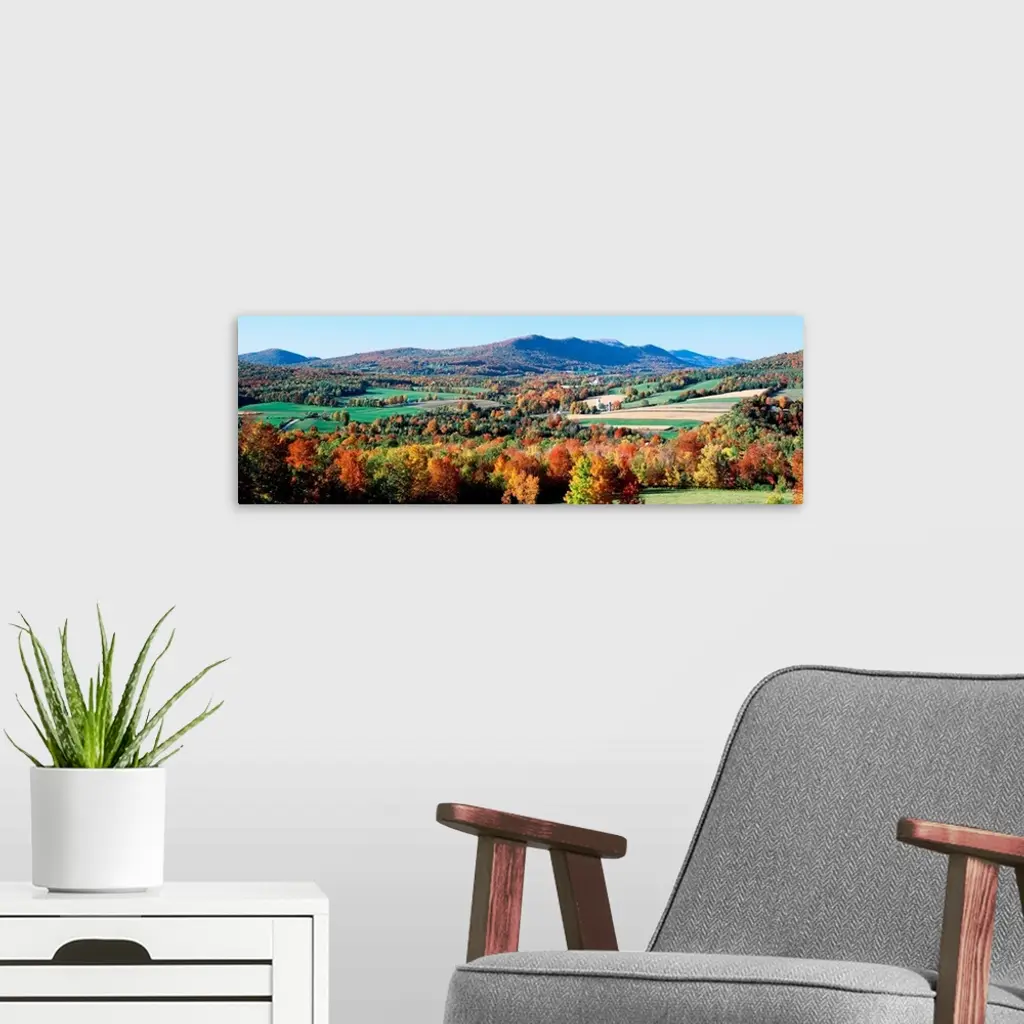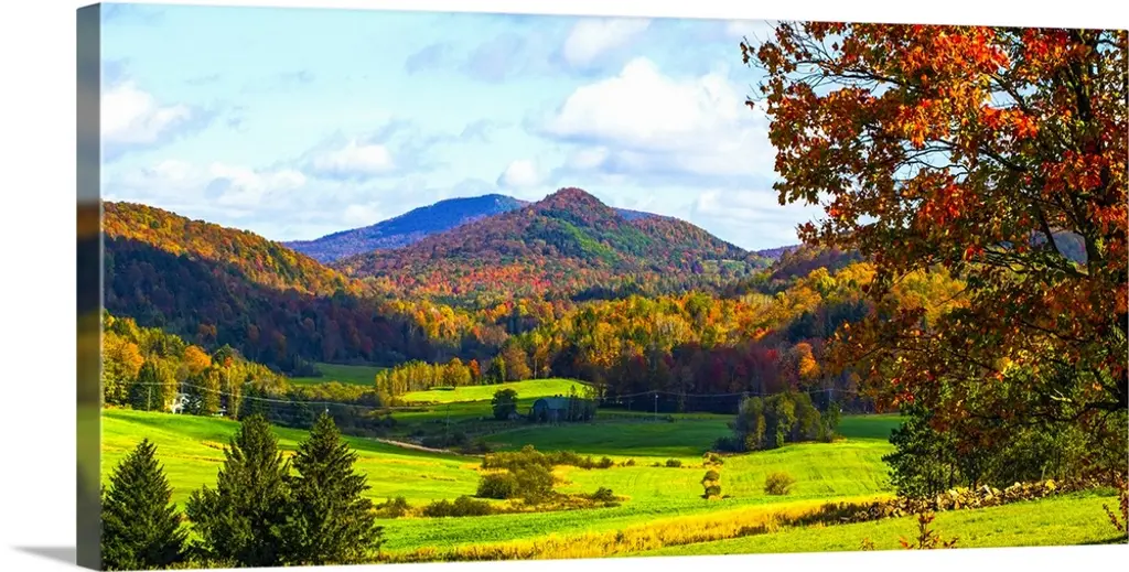 A valley in New England filled with open pastures and accented with trees covered with leaves turning in autumn.