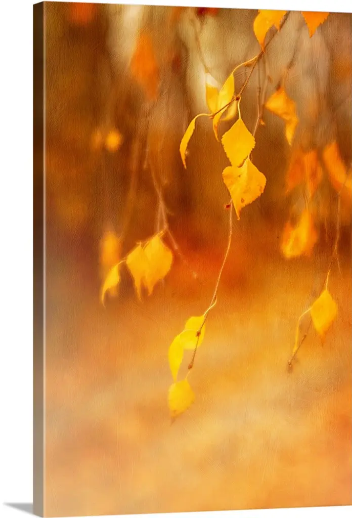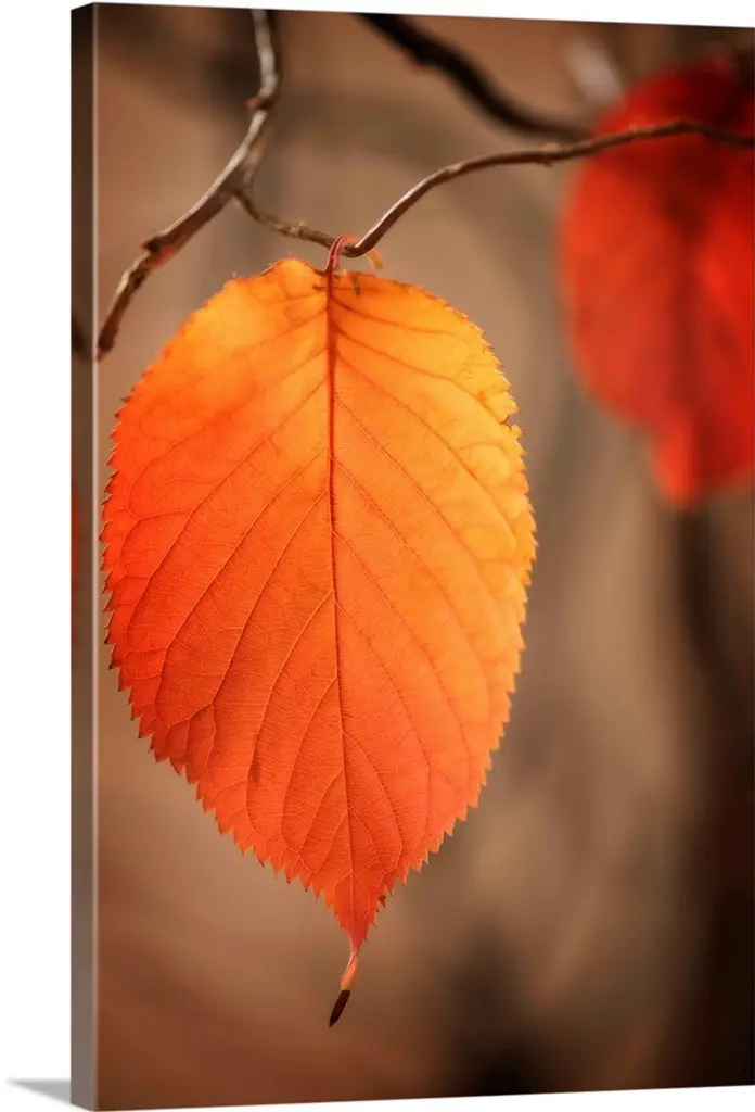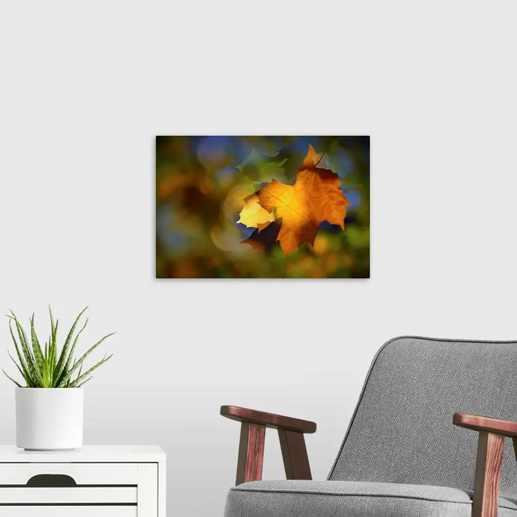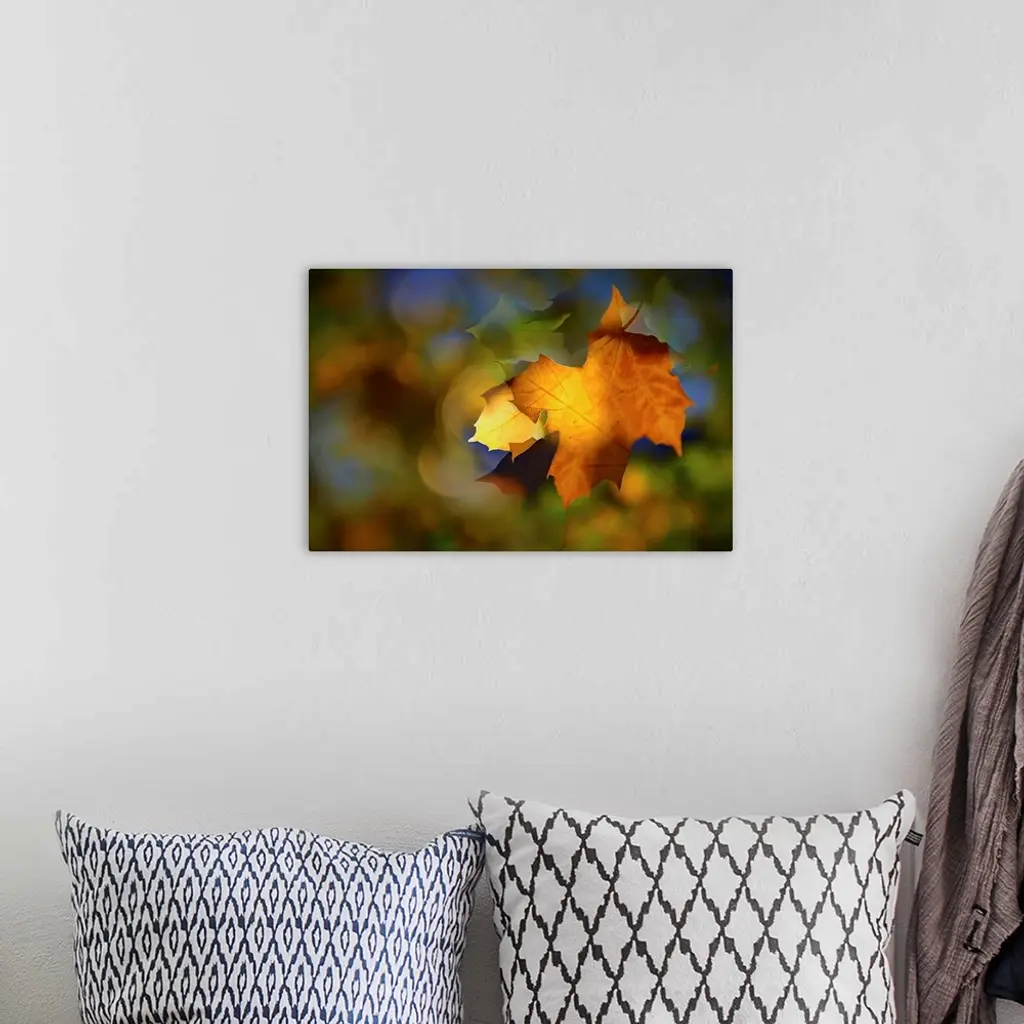 Photograph of a close-up of fall leaves seen through a other leaves and branches of the tree.