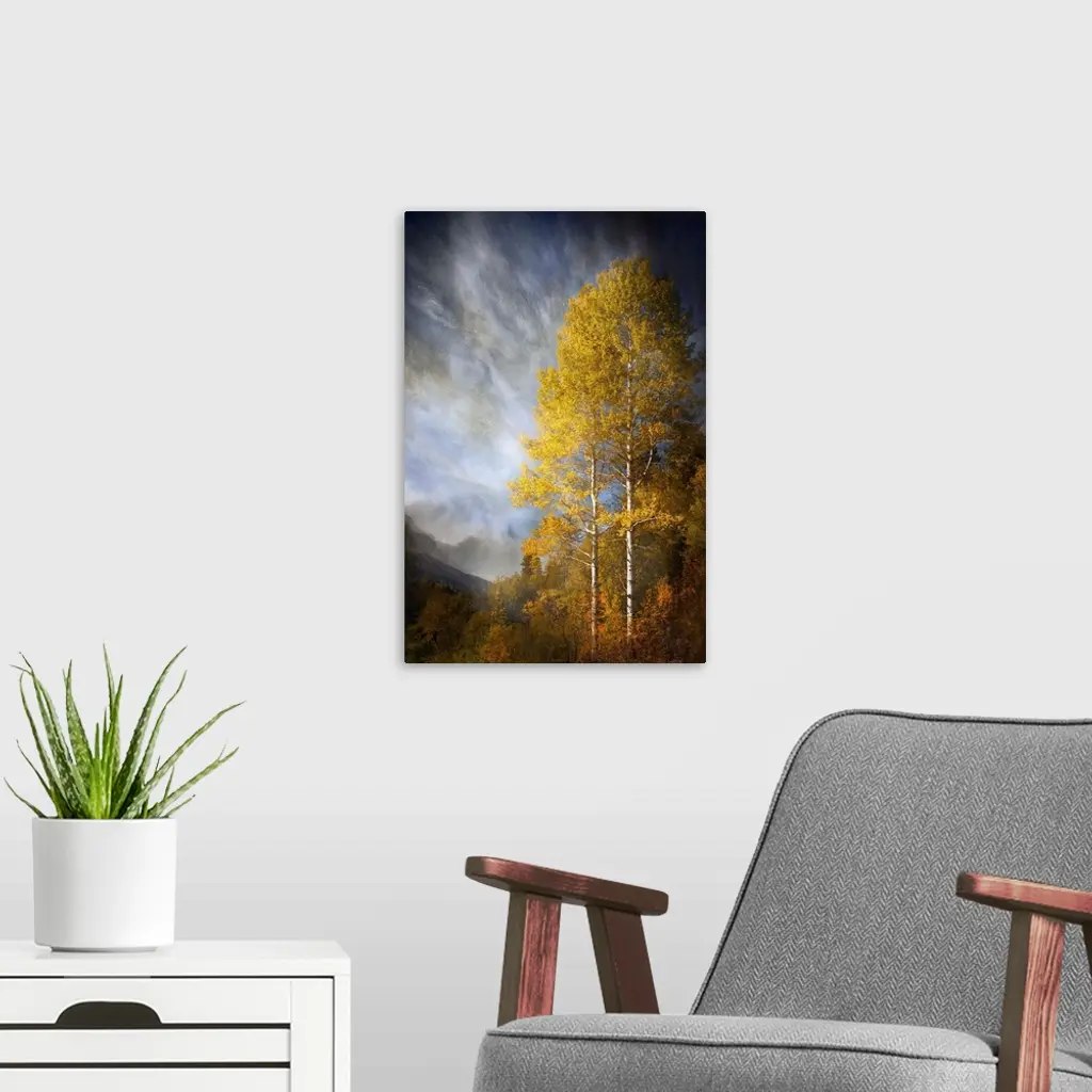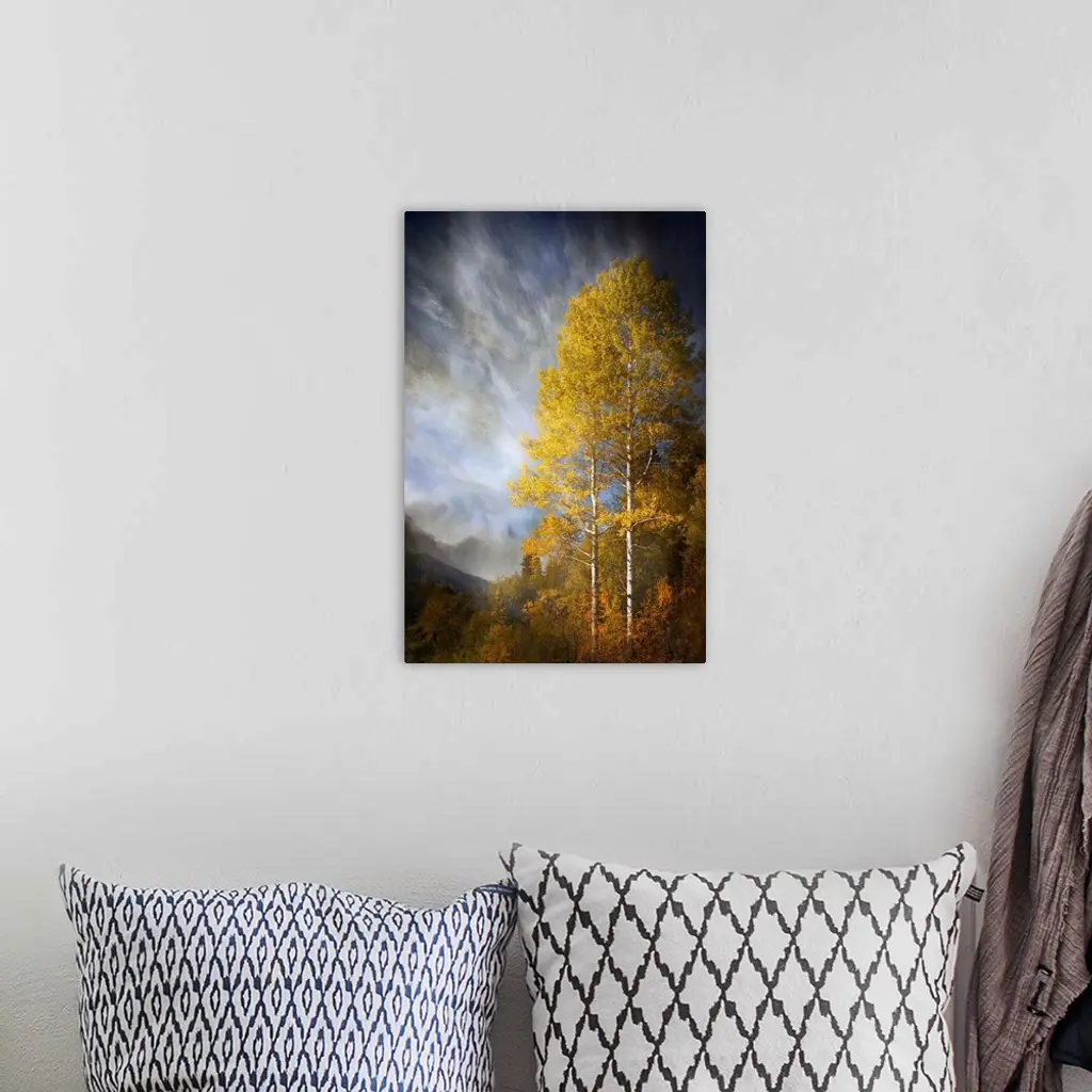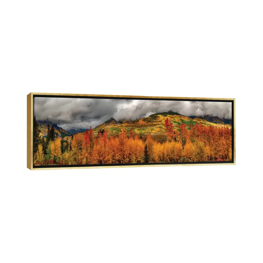 Photograph of a forest clearing in autumn foliage, under dramatic clouds.